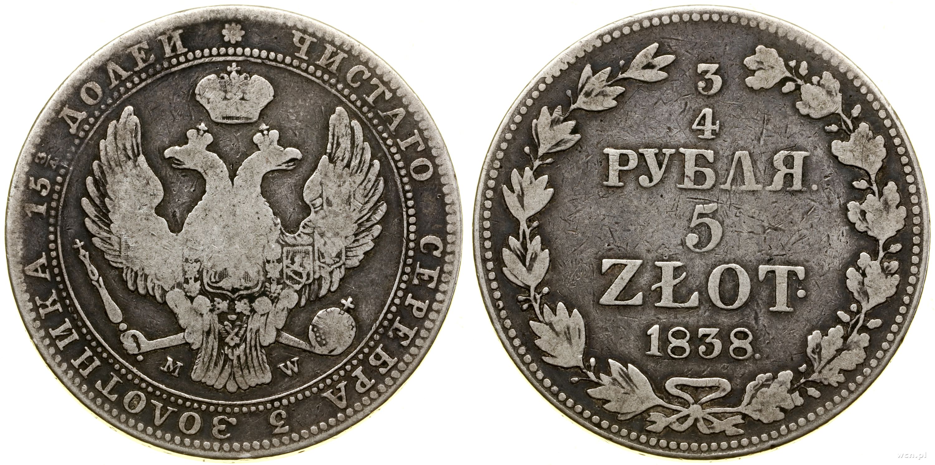 Polska, 3/4 rubla = 5 złotych, 1838 MW