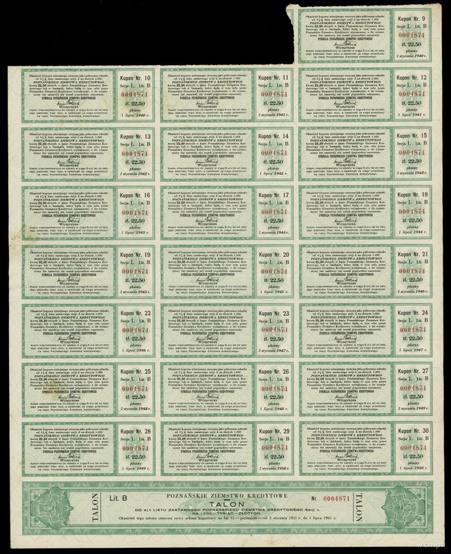 | Opis: | Polska - Poznańskie Ziemstwo Kredytowe, 4 1/2 % list zastawny na 1.000 złotych, 1.07.1935, Poznań, seria L - B, numeracja 0004871, z talonem i 22 kuponami |