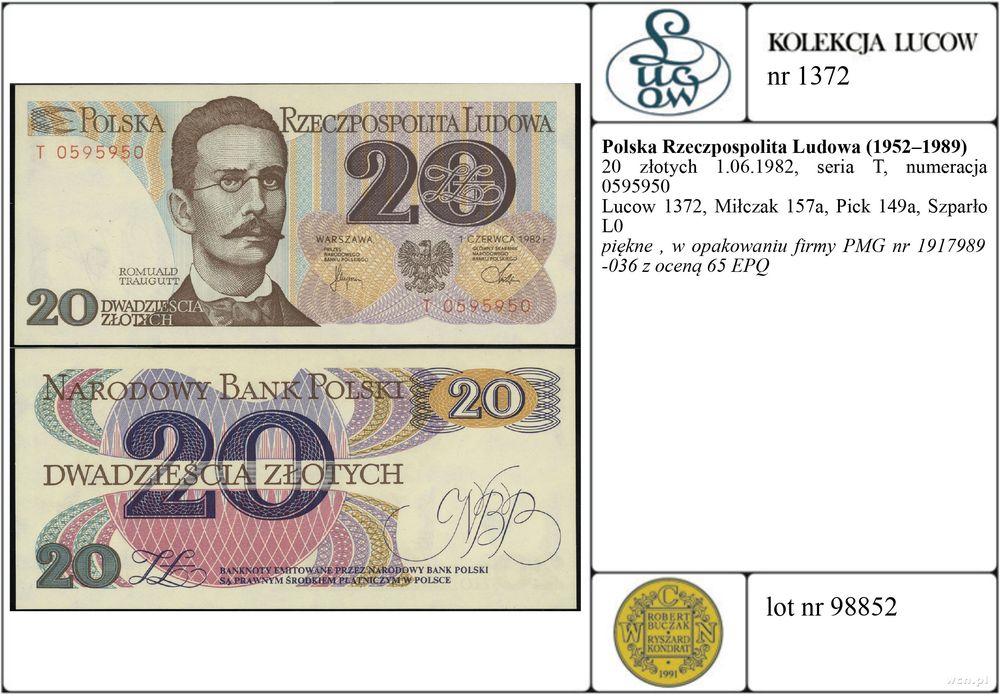| Opis: | Polska - Polska Rzeczpospolita Ludowa (1952–1989), 20 złotych, 1.06.1982, seria T, numeracja 0595950 |