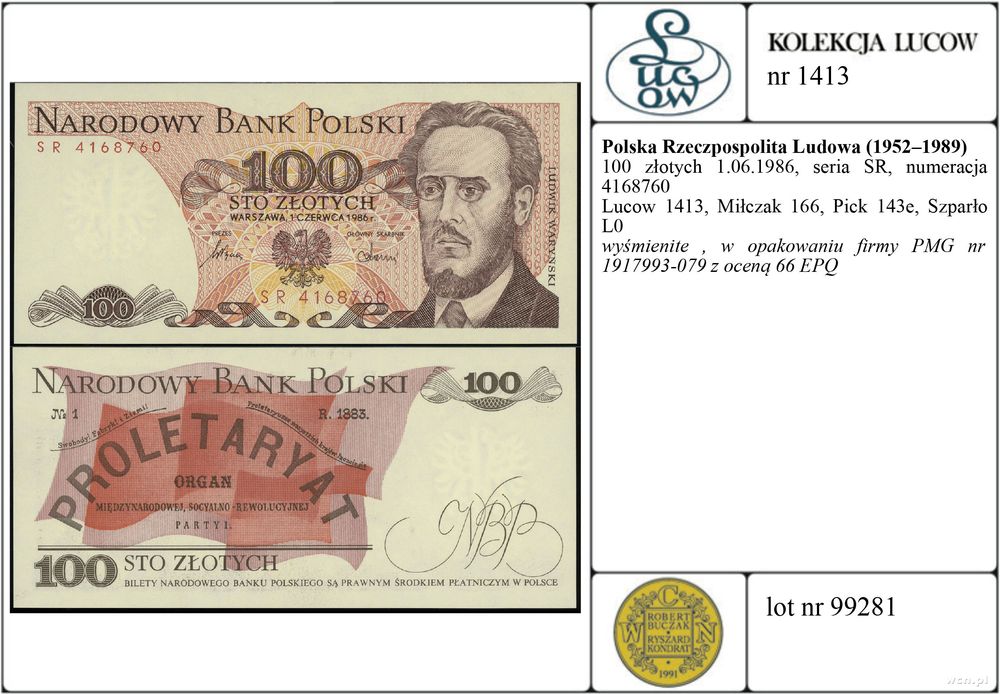 | Opis: | Polska - Polska Rzeczpospolita Ludowa (1952–1989), 100 złotych, 1.06.1986, seria SR, numeracja 4168760 |