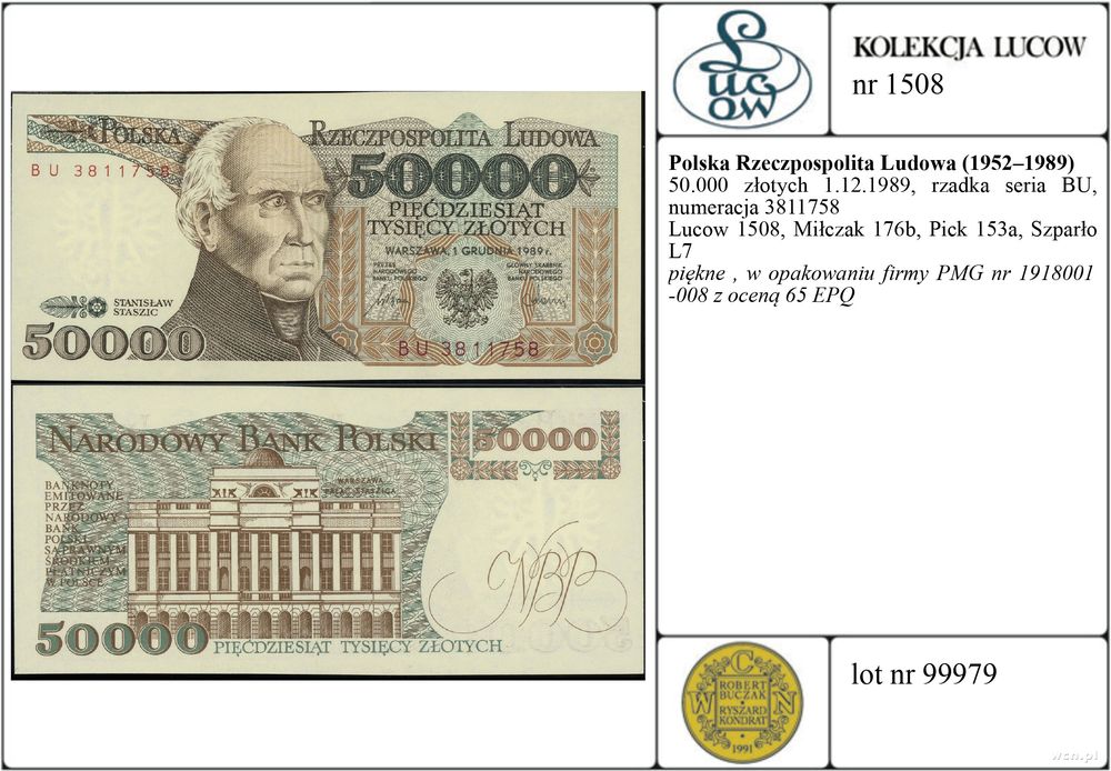 | Opis: | Polska - Polska Rzeczpospolita Ludowa (1952–1989), 50.000 złotych, 1.12.1989, rzadka seria BU, numeracja 3811758 |