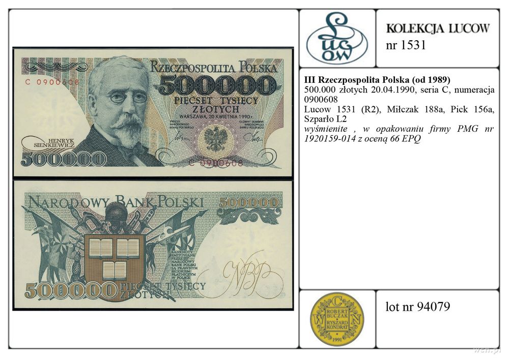 | Opis: | Polska - III Rzeczpospolita Polska (od 1989), 500.000 złotych, 20.04.1990, seria C, numeracja 0900608 |