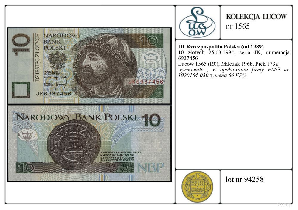 | Opis: | Polska - III Rzeczpospolita Polska (od 1989), 10 złotych, 25.03.1994, seria JK, numeracja 6937456 |