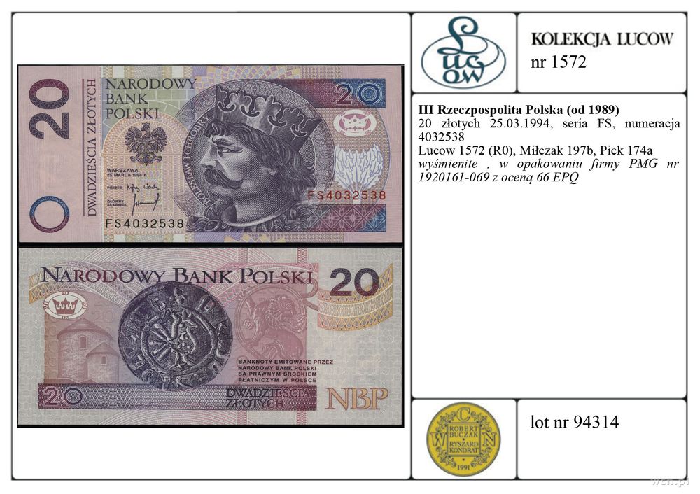 | Opis: | Polska - III Rzeczpospolita Polska (od 1989), 20 złotych, 25.03.1994, seria FS, numeracja 4032538 |