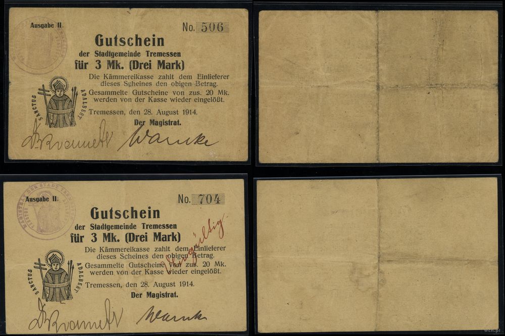 | Opis: | Wielkopolska - Trzemeszno - Magistrat Miasta, zestaw 5 banknotów, 1914, nominały: 1/2 marki, 1 marka (I emisja), 1 marka (II emisja), 3 marki (II emisja), 3 marki (II emisja) |