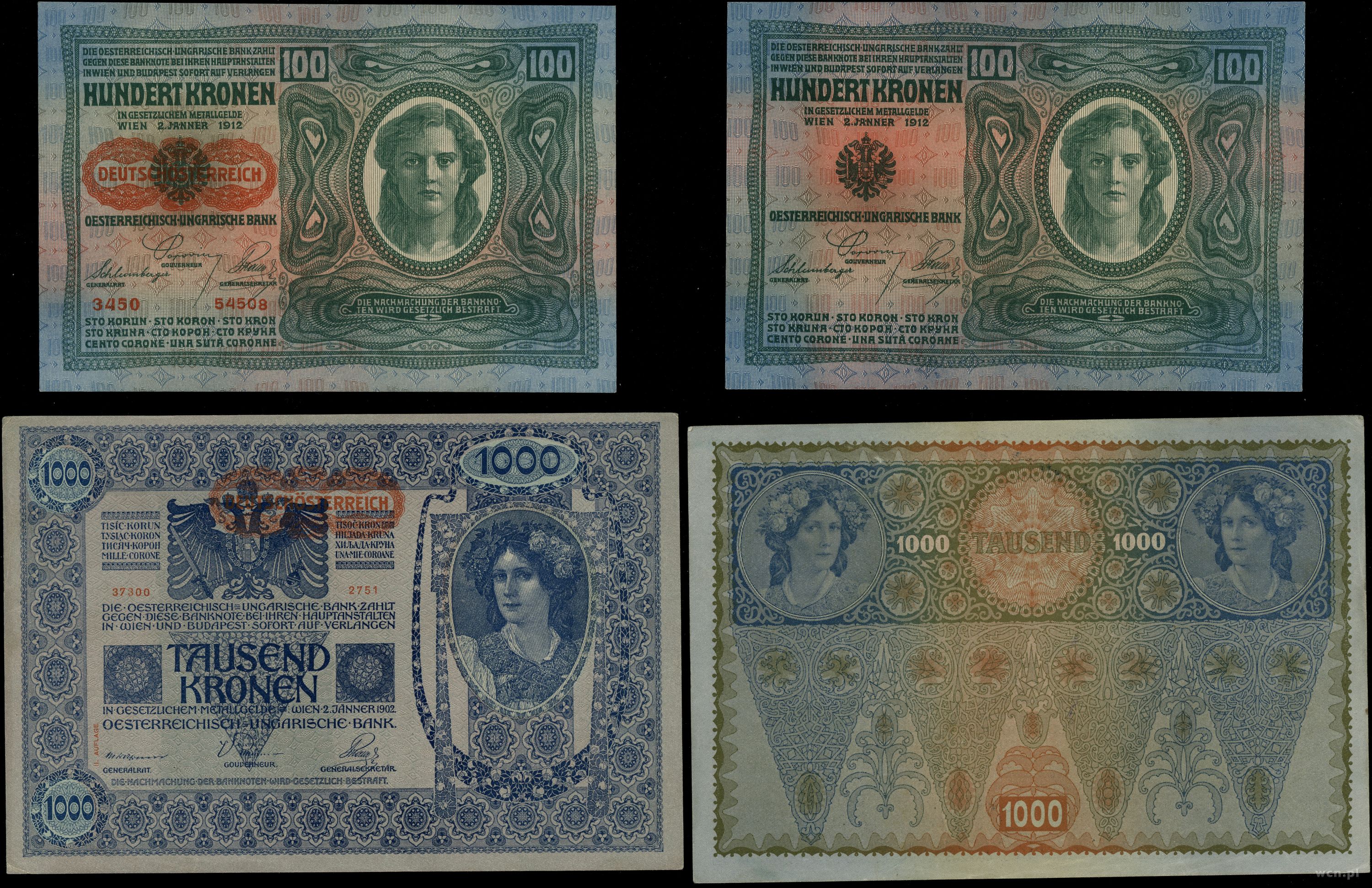 Austria, zestaw: 100 i 1000 koron z nadrukami DEUTSCHÖSTERREICH, 1919/1920