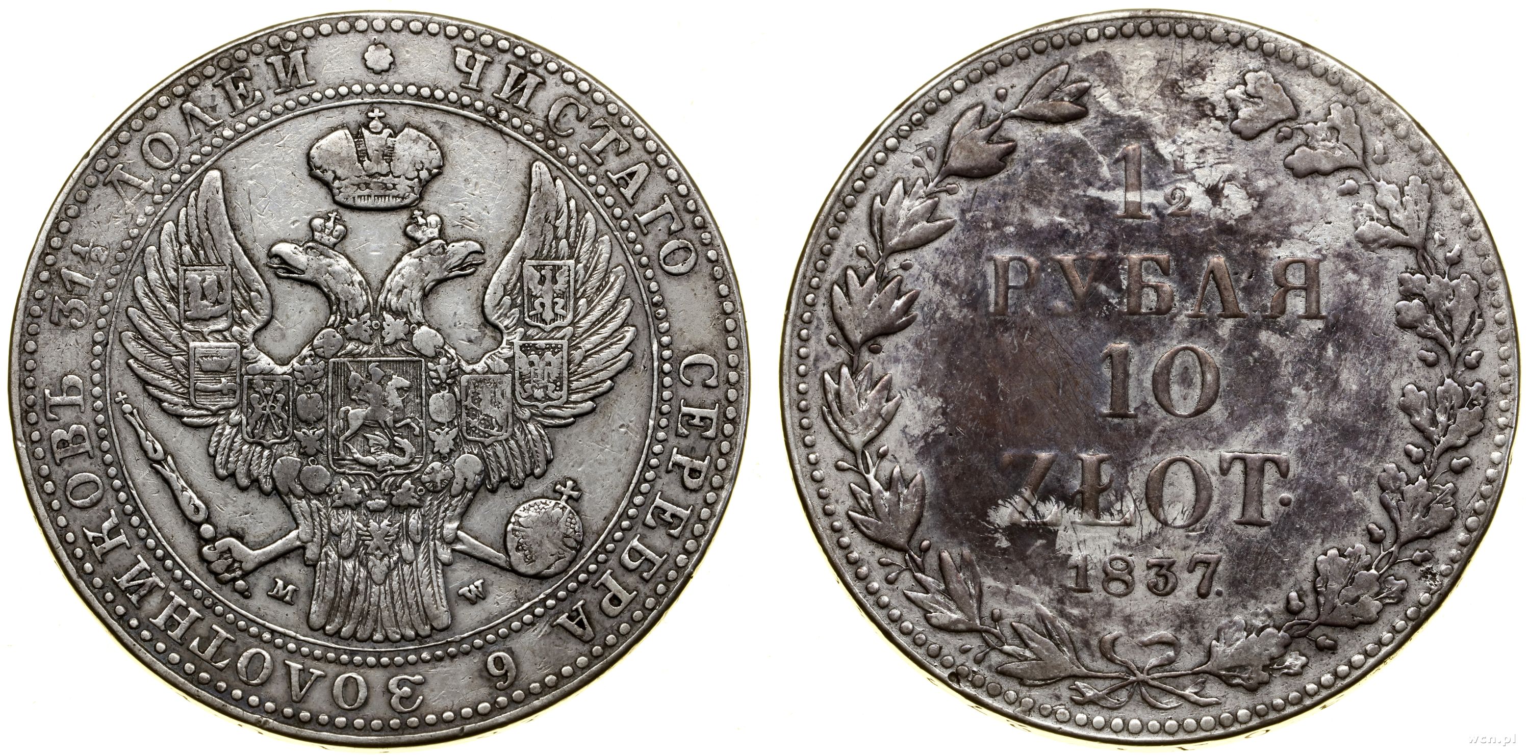 Polska, 1 1/2 rubla = 10 złotych, 1837 MW