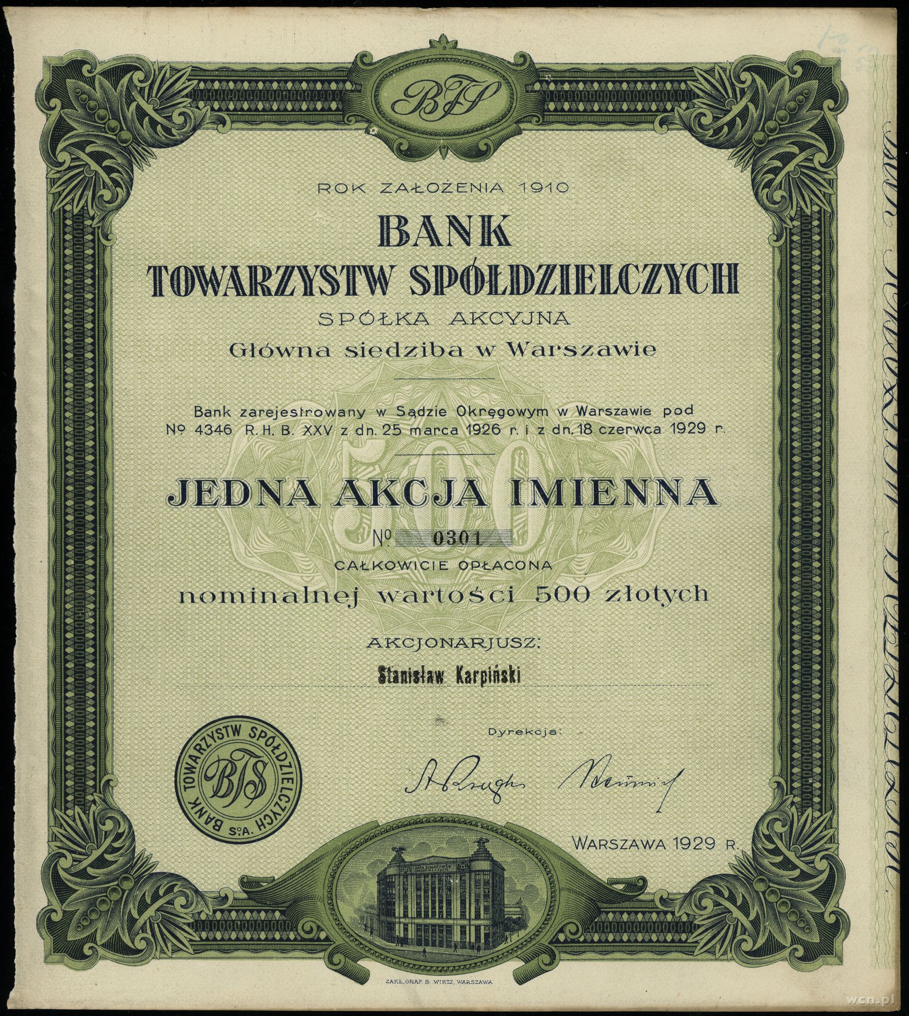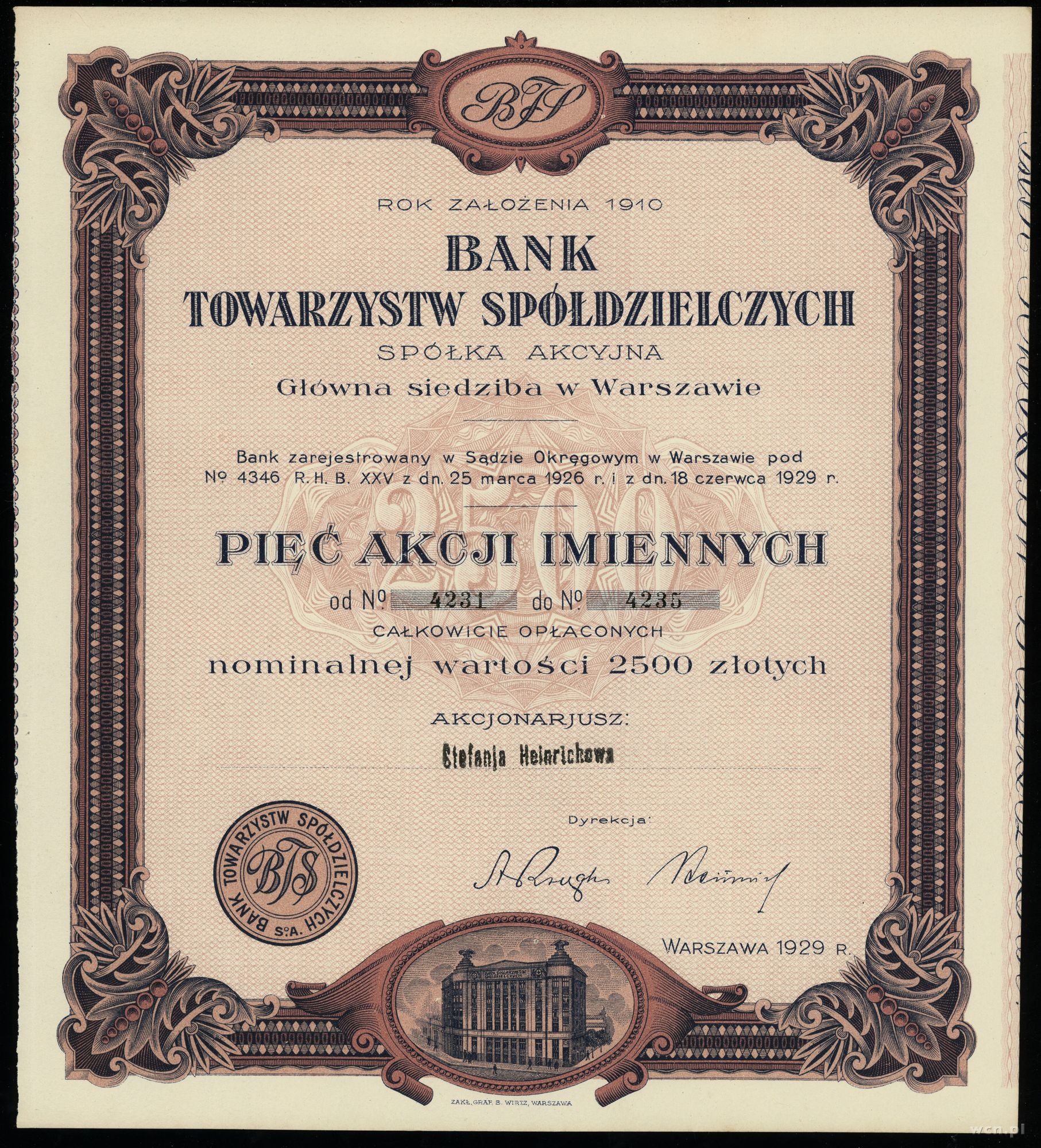 Polska, 5 akcji po 500 złotych = 2.500 złotych, 1929