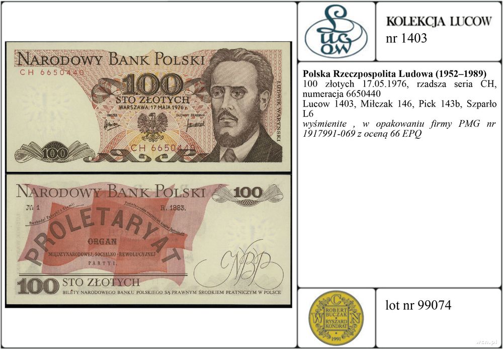 | Opis: | Polska - Polska Rzeczpospolita Ludowa (1952–1989), 100 złotych, 17.05.1976, rzadsza seria CH, numeracja 6650440 |