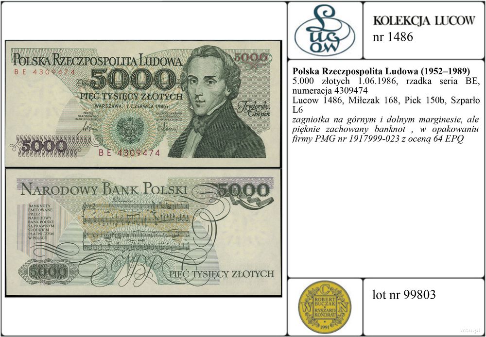 | Opis: | Polska - Polska Rzeczpospolita Ludowa (1952–1989), 5.000 złotych, 1.06.1986, rzadka seria BE, numeracja 4309474 |