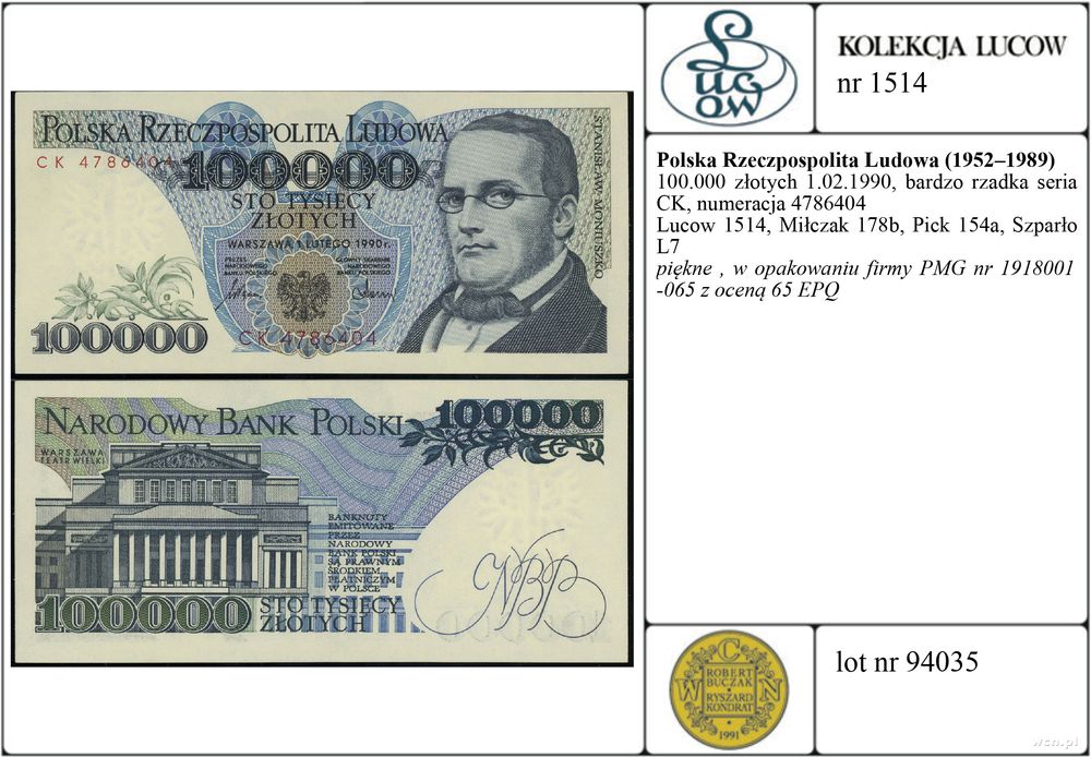| Opis: | Polska - Polska Rzeczpospolita Ludowa (1952–1989), 100.000 złotych, 1.02.1990, bardzo rzadka seria CK, numeracja 4786404 |