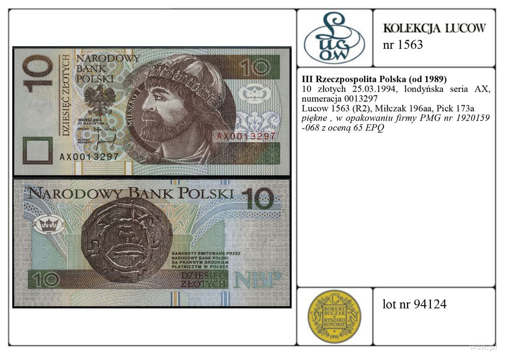 | Opis: | Polska - III Rzeczpospolita Polska (od 1989), 10 złotych, 25.03.1994, londyńska seria AX, numeracja 0013297 |