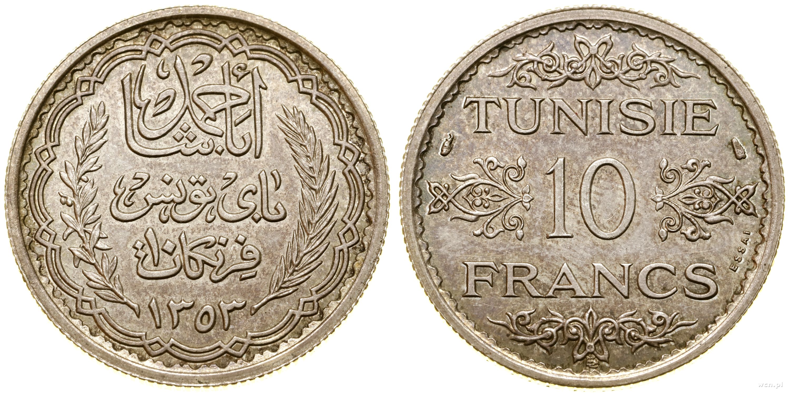 Tunezja, 10 franków, AH 1353 (1935)