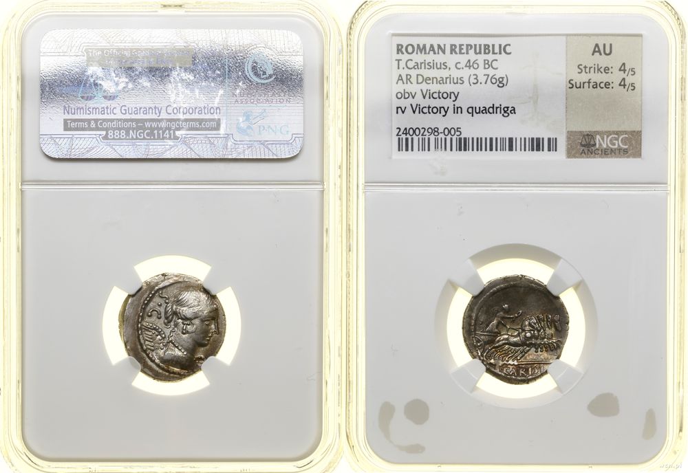 | Opis: | Republika Rzymska - T. Carisius (46 pne), denar, 46 pne, Rzym, Aw: Głowa Wiktorii w prawo, z lewej SC, Rw: Wiktoria trzymająca lejce i wieniec, w kwadrydze w prawo, w odcinku legenda T CARISI |