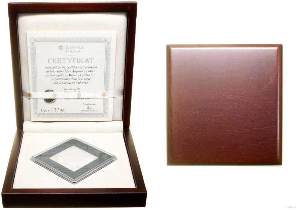 | Dodatkowe informacje: | srebro próby 925, ok. 28.28 g, stemple lustrzane, nakład tylko 500 sztuk, klipa w drewnianym pudełku z dołączonym certyfikatem NBP nr. 027 |