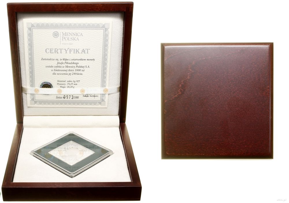 | Dodatkowe informacje: | srebro próby 925, ok. 28.28 g, stemple lustrzane, nakład tylko 1.000 sztuk, klipa w drewnianym pudełku z dołączonym certyfikatem NBP nr. 0973 |