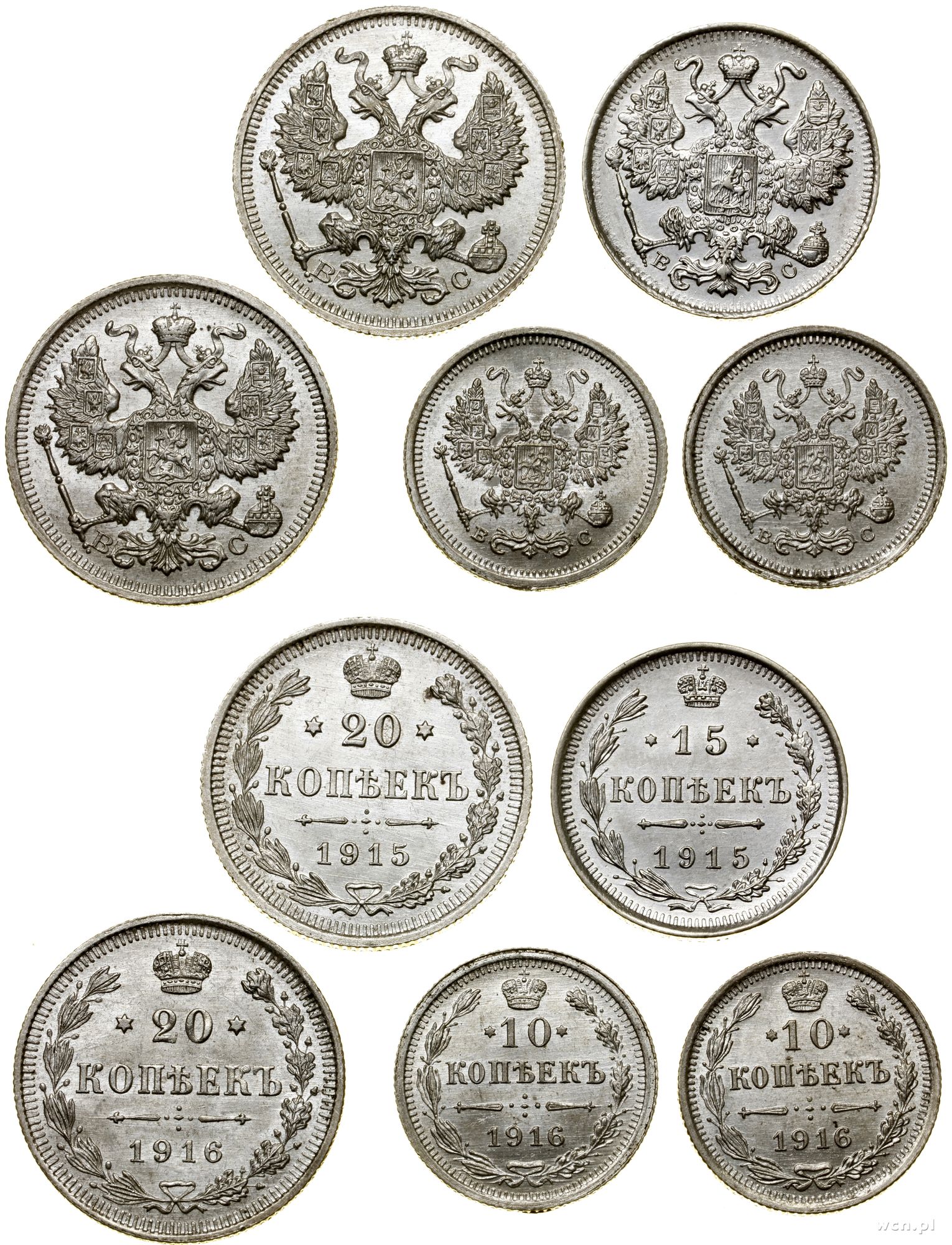 Rosja, zestaw 5 monet, 1915–1916