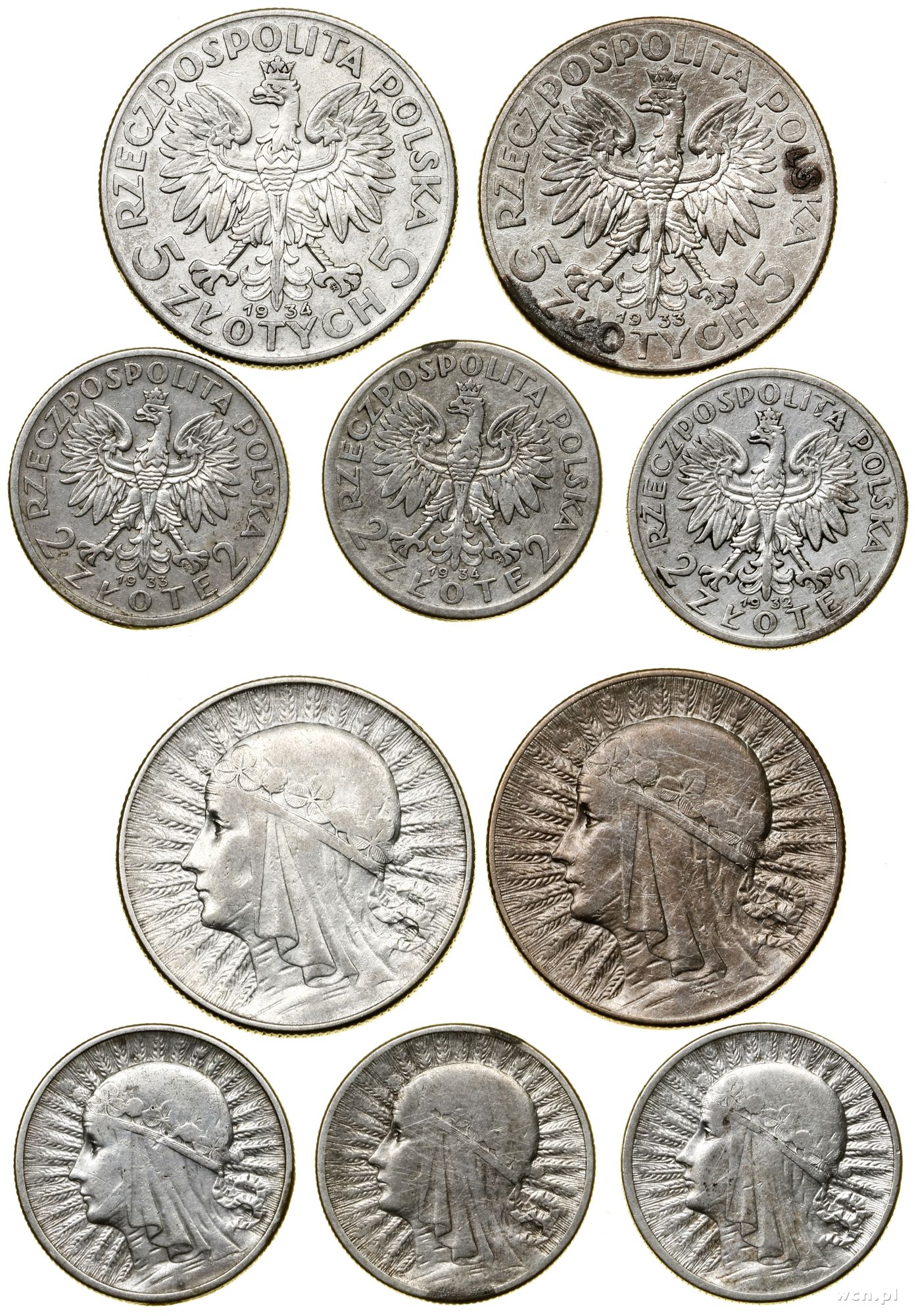 Polska, zestaw 5 monet, 1932–1934