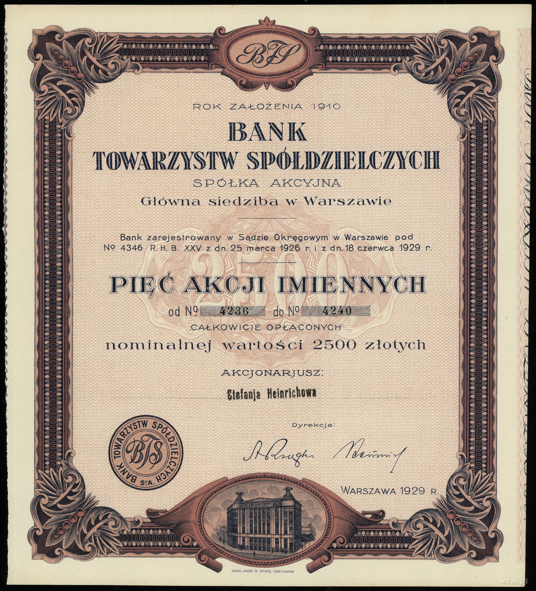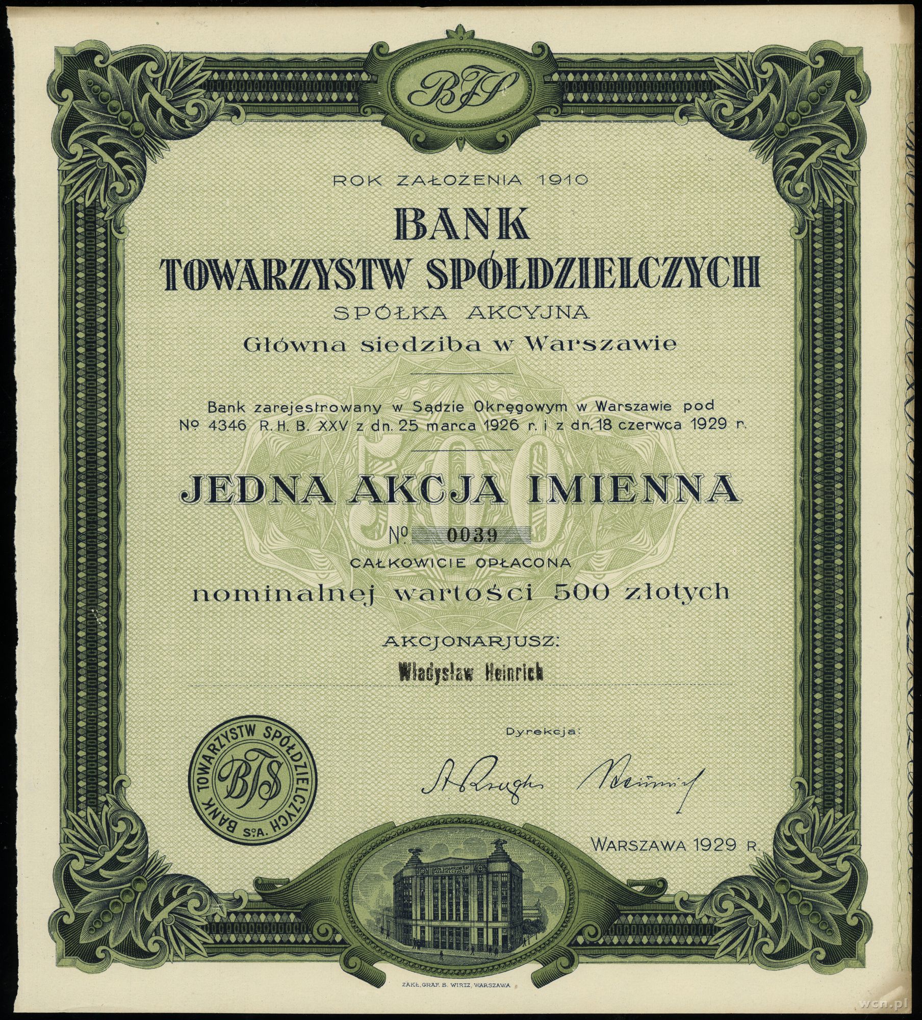 numeracja 0039, akcja wystawiana na Pana Władysława Heinr... | I/I- |
