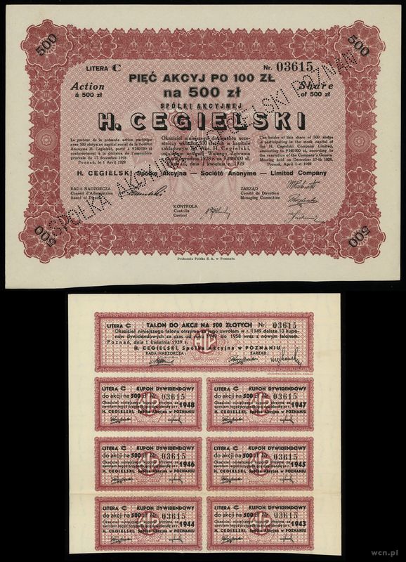| Opis: | Polska, zestaw 2 akcji, 1929–1931, 1) 5 akcji po 100 złotych = 500 złotych, 1.04.1929, Poznań, H. Cegielski S.A. 2) akcja na 100 złotych 1931, Warszawa, Warszawskie Towarzystwo Ubezpieczeń S.A. |