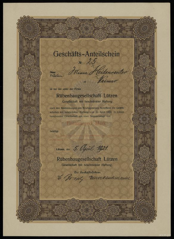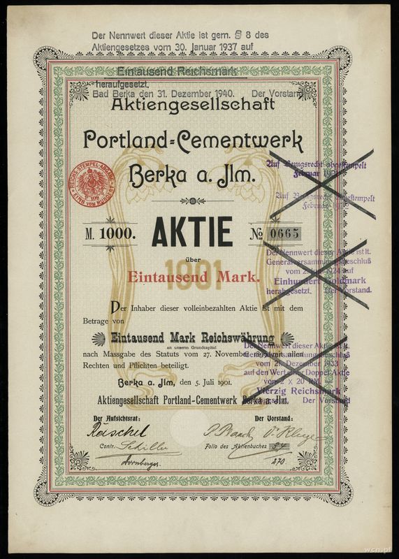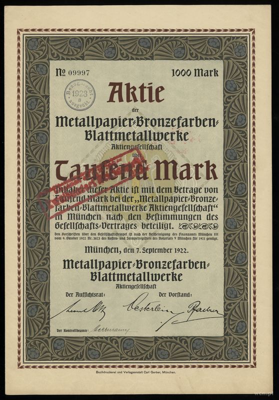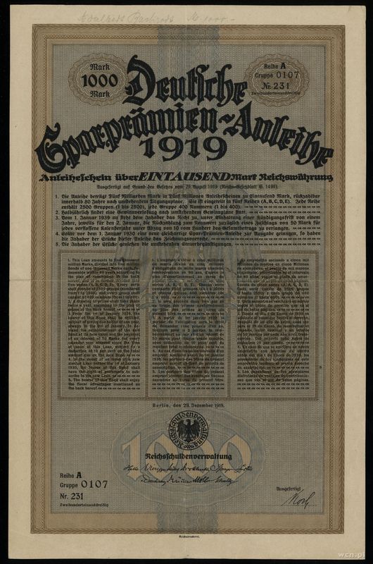 | Opis: | Niemcy, zestaw 9 niemieckich papierów wartościowych, w zestawie: 1.200 marek 1923, 20 goldmarek 1924, 5.000 marek 1921, 10.000 marek 1923, 1.000 marek 1938, 1.000 marek 1921, 1.000 marek 1901, 1.000 marek 1922, 1.000 marek 1919 |