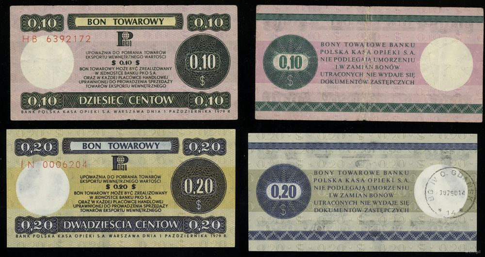 | Opis: | Polska - Bony towarowe - Bank Polska Kasa Opieki S.A., zestaw 6 bonów, 1969–1979, w zestawie: 1 cent, 2 centy 1969, 1 cent, 5 centów, 10 centów, 20 centów 1979 |