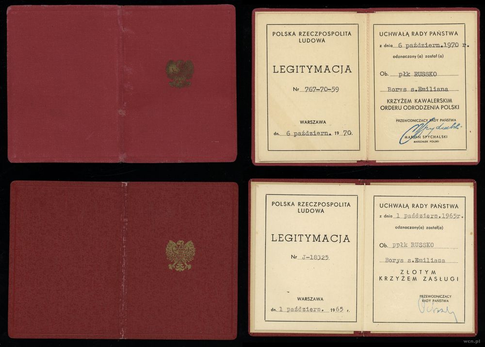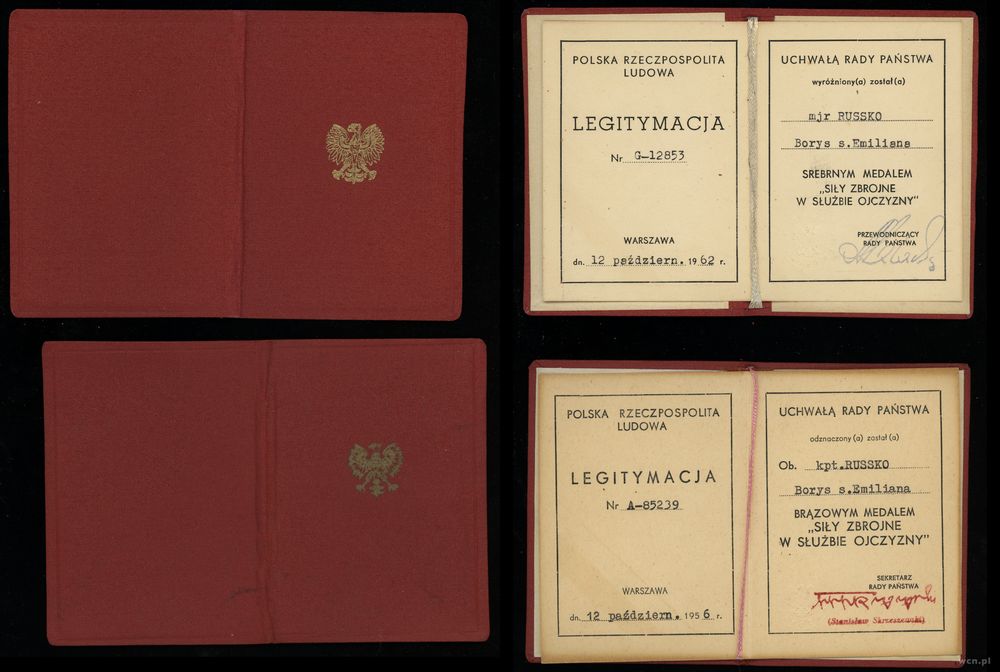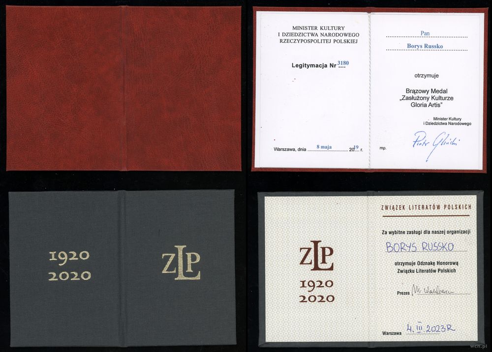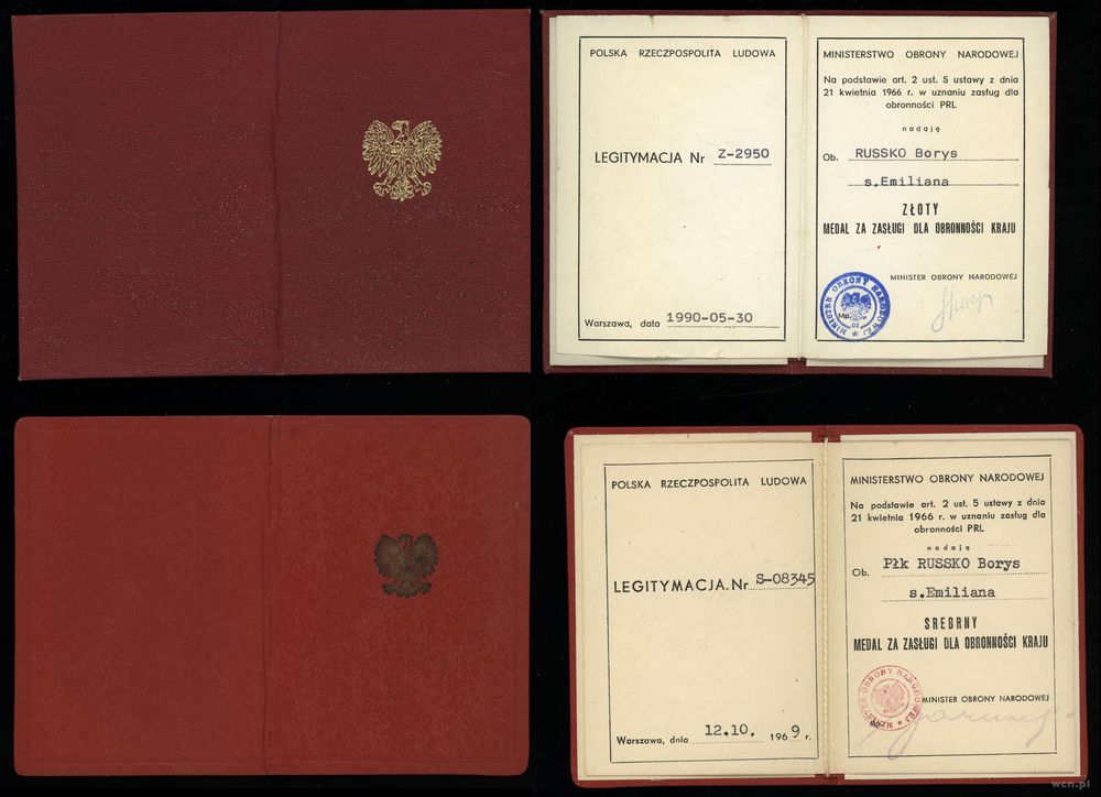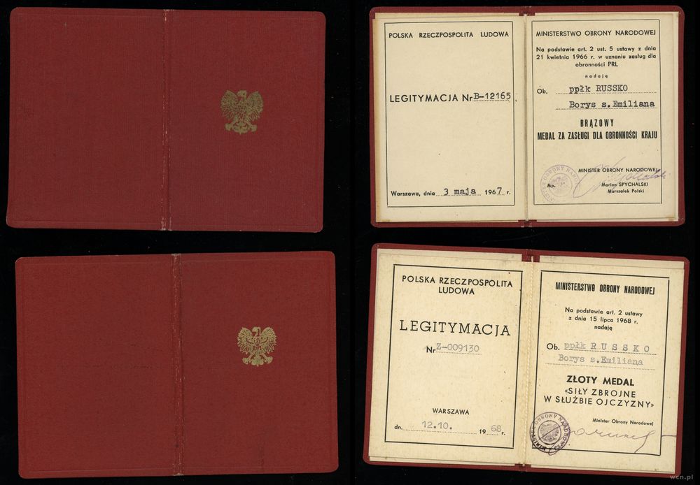 | Opis: | Polska - XX wiek - Polska powojenna i Polska Rzeczpospolita Ludowa (1945–1989), Zestaw pamiątek wystawionych na nazwisko Russko Borys, w skład zestawu wchodzi: – Brązowy Medal "Zasłużony Kulturze Gloria Artis" z miniaturą i legitymacją, – Odznaka Honorowa Związku Literatów Polskich z legitymacją, – Legitymacja: Krzyż Kawalerski Orderu Odrodzenia Polski, – Legitymacja: Złoty Krzyż Zasługi, – Legitymacja: Złoty Medal Za Zasługi dla Obronności Kraju, – Legitymacja: Srebrny Medal Za Zasługi dla Obronności Kraju, – Legitymacja: Brązowy Medal Za Zasługi dla Obronności Kraju, – Legitymacja: Złoty Medal Siły Zbrojne w Służbie Ojczyzny, – Legitymacja: Srebrny Medal Siły Zbrojne w Służbie Ojczyzny, – Legitymacja: Brązowy Medal Siły Zbrojne w Służbie Ojczyzny, – Legitymacja: Medal 40-lecia Polski Ludowej, – Legitymacja: Złoty Medal Zasługi dla Pożarnictwa, – Pamiątkowa plakietka |