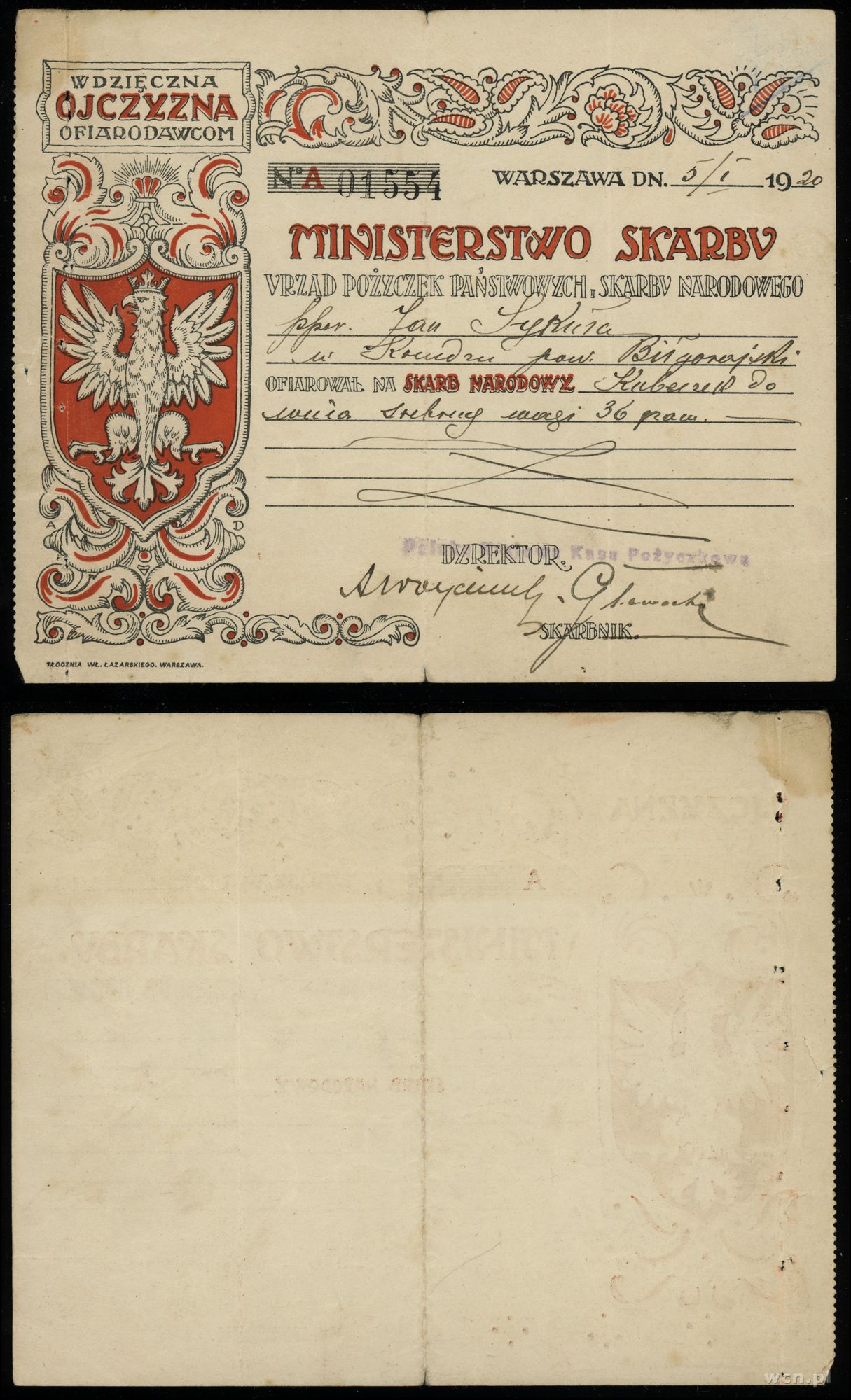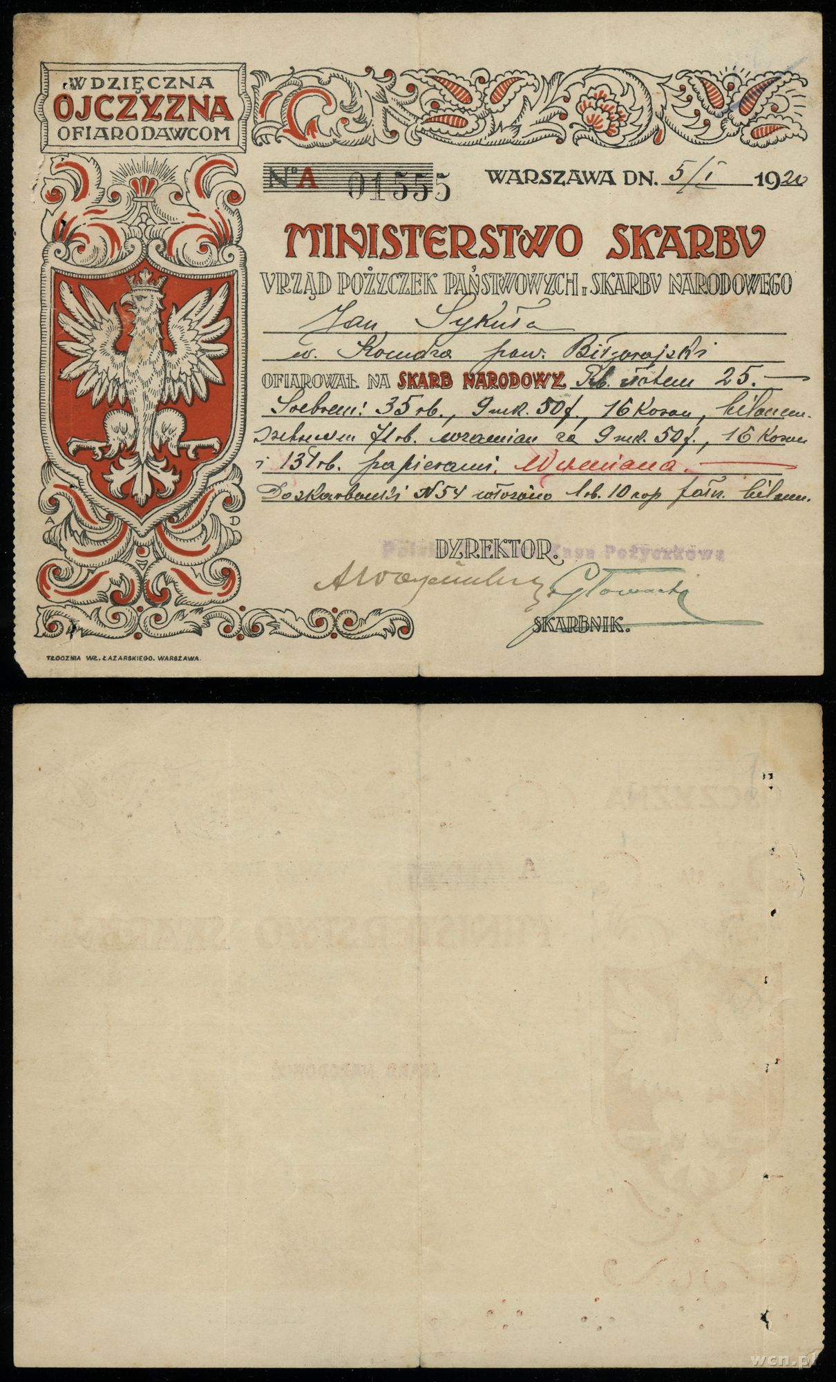 seria A, numeracja 01555, ofiarowane zostało: 25 rubli zł... | III+ |