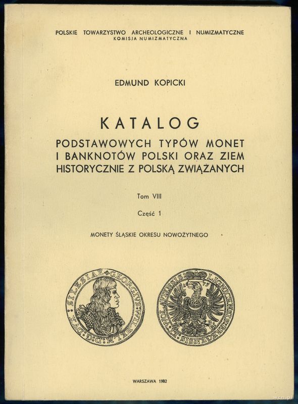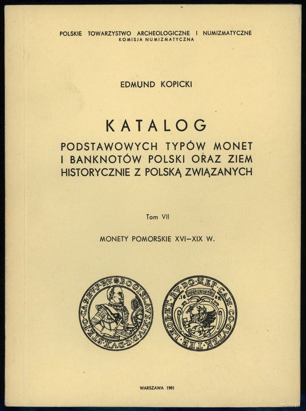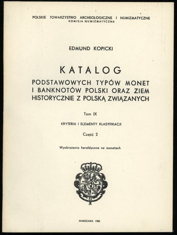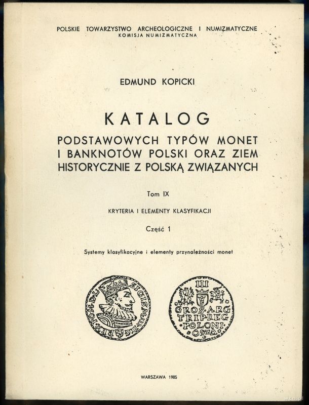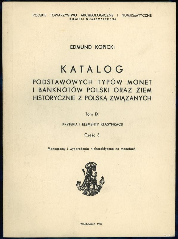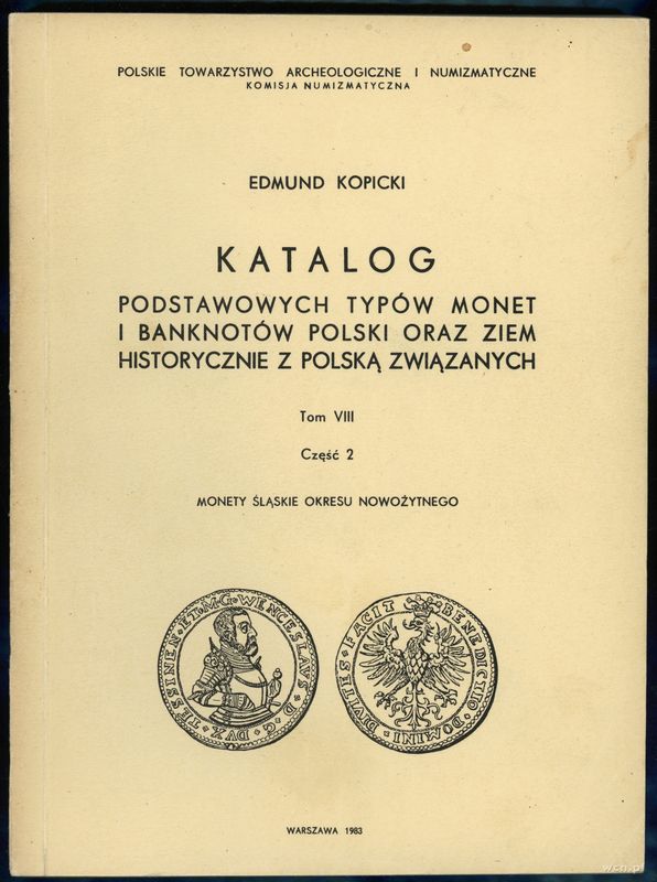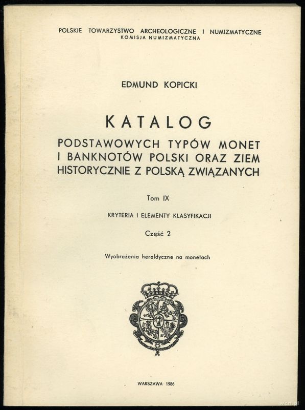 | Opis: | wydawnictwa polskie, zestaw 11 książek, 1) Kopicki Edmund – Katalog podstawowych typów monet i banknotów Polski oraz ziem historycznie z Polską związanych - tom IV, monety i banknoty okresu porozbiorowego 1772–1886, Warszawa 1978, 2) Kopicki Edmund - Katalog podstawowych typów monet i banknotów Polski oraz ziem historycznie z Polską związanych - tom V, 1916–1978, część 1, Warszawa 1979, 3) Kopicki Edmund – Katalog podstawowych typów monet i banknotów Polski oraz ziem historycznie z Polską związanych; Tom V, 1916–1978, część 2, Warszawa 1979, 4) Kopicki Edmund – Katalog Podstawowych Typów Monet i Banknotów Polski oraz Ziem Historycznie z Polską Związanych, Tom VI, monety obce władców Polski i pretendentów do korony polskiej 1002–1794, Warszawa 1980, 5) Kopicki Edmund – Katalog podstawowych typów monet i banknotów Polski oraz ziem historycznie z Polską związanych; tom VII, Monety pomorskie XVI-XIX w., Warszawa 1981, pojedyncze zaznaczenia ołówkiem i długopisem 6) Kopicki Edmund – Katalog podstawowych typów monet i banknotów Polski oraz ziem historycznie z Polską związanych; tom VIII, monety śląskie okresu nowożytnego, Część 1, Warszawa 1982, 7) Kopicki Edmund – Katalog podstawowych typów monet i banknotów Polski oraz ziem historycznie z Polską związanych; tom VIII, monety śląskie okresu nowożytnego, Część 2, Warszawa 1983, 8) Kopicki Edmund – Katalog podstawowych typów monet i banknotów Polski oraz ziem historycznie z Polską związanych; tom IX, Kryteria i elementy klasyfikacji, część 1, Systemy klasyfikacyjne i elementy przynależności monet, Warszawa 1985, 9) Kopicki Edmund – Katalog podstawowych typów monet i banknotów Polski oraz ziem historycznie z Polską związanych; tom IX, Kryteria i elementy klasyfikacji, część 2, Wyobrażenia heraldyczne na monetach, Warszawa 1986, 10) Kopicki Edmund – Katalog podstawowych typów monet i banknotów Polski oraz ziem historycznie z Polską związanych; tom IX, Kryteria i elementy klasyfikacji, część 2, Wyobrażenia heraldyczne na monetach, Warszawa 1986, 11) Kopicki Edmund – Katalog podstawowych typów monet i banknotów Polski oraz ziem historycznie z Polską związanych; tom IX, Kryteria i elementy klasyfikacji, część 3, Monogramy i wyobrażenia nieheraldyczne na monetach, Warszawa 1989 |