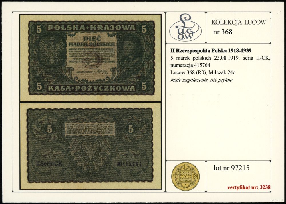 | Opis: | Polska - II Rzeczpospolita Polska (1918–1939) - emisje przed reformą Władysława Grabskiego, 5 marek polskich, 23.08.1919, seria II-CK, numeracja 415764 |
