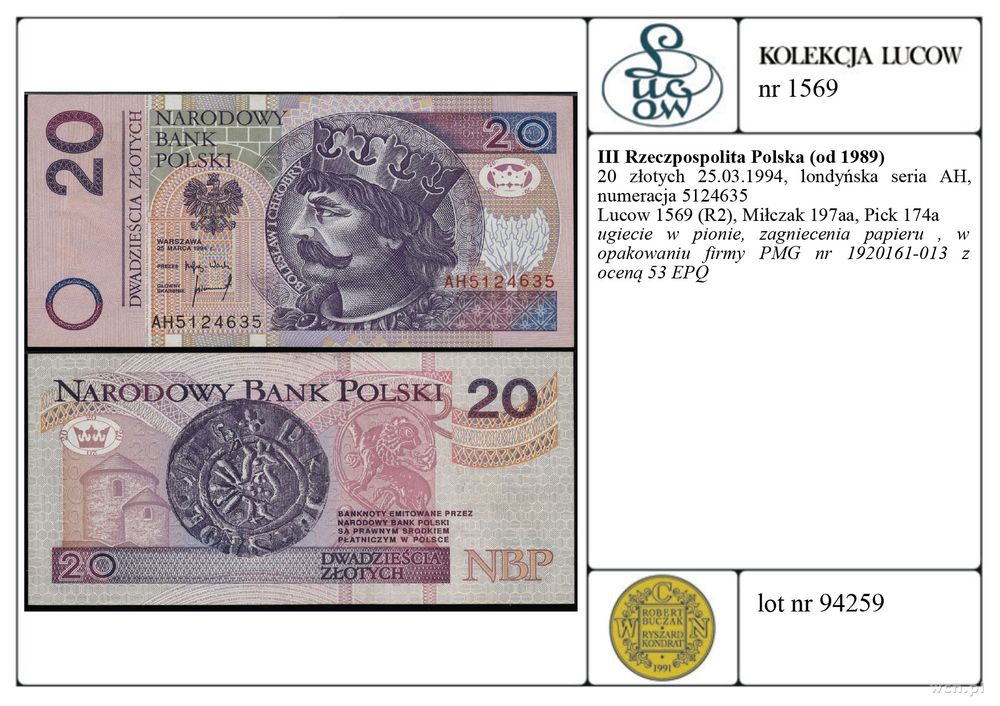 | Opis: | Polska - III Rzeczpospolita Polska (od 1989), 20 złotych, 25.03.1994, londyńska seria AH, numeracja 5124635 |