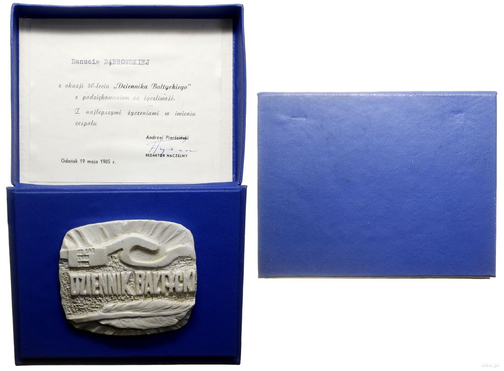 | Opis: | Polska - Polska Rzeczpospolita Ludowa (1952–1989), 40 lat Dziennika Bałtyckiego, 1985, Kontur wybrzeża, po lewej 40 LAT / 1945 / 1985, na środku DZIENNIK BAŁTYCKI, niżej pióro, medal wklejony w pudełko z nadaniem |