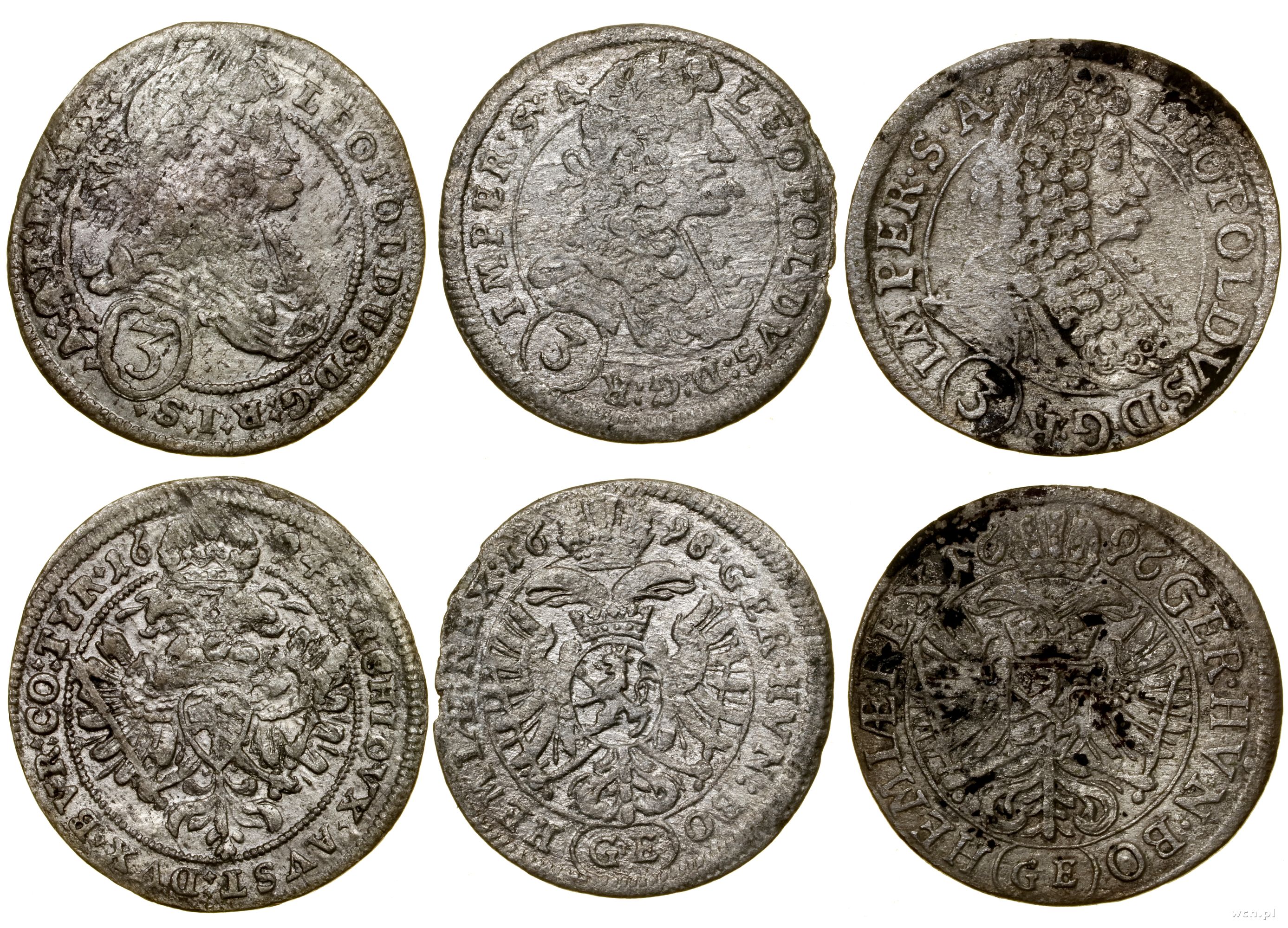 Austria, zestaw 3 x 3 krajcary, 1694 (Wiedeń), 1694 GE (Praga), 1696 GE
