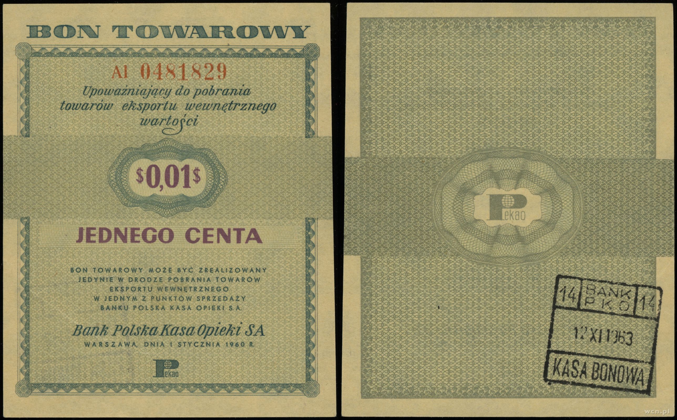 Polska, bon na 1 cent, 1.01.1960