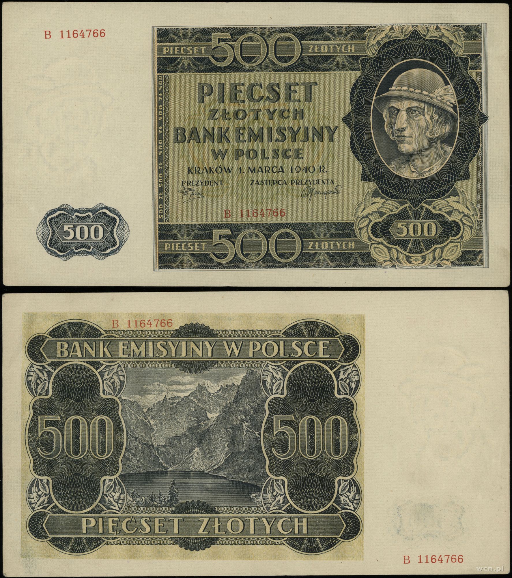 1940 - 20 złotych seria H, 100 złotych seria E, 500 złoty... | II/III- |