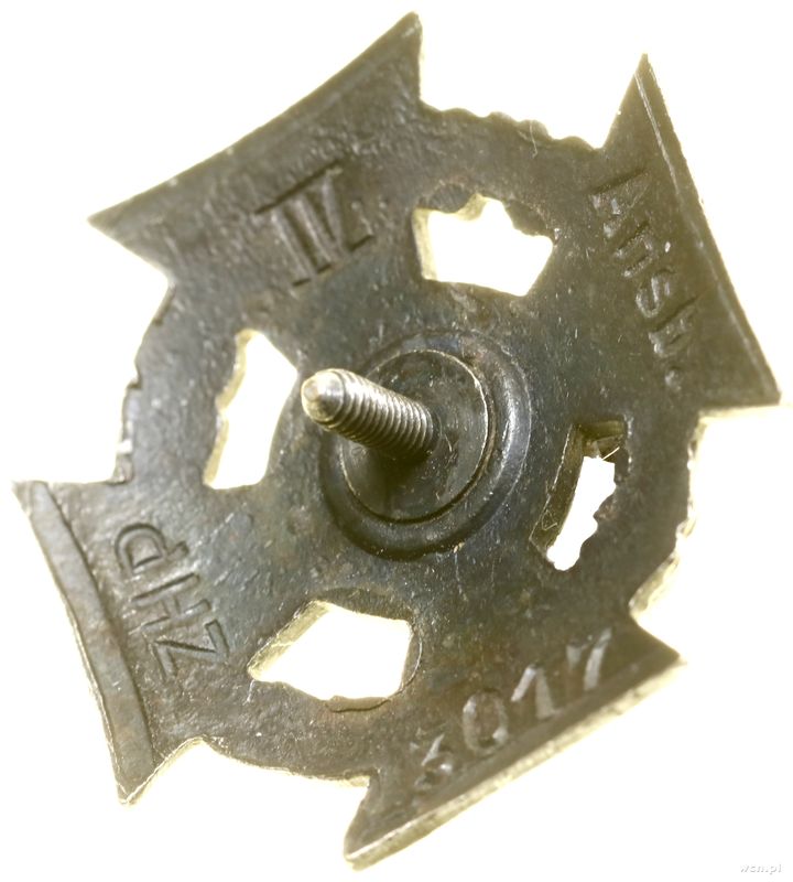 | Opis: | Polska - RP na Emigracji, Krzyż Harcerski, 1946, Ansbach, Krzyż, w kątach wieniec, na poziomej belce CZU - WAJ, w medalionie lilia w promieniach, na stronie odwrotnej IV - Ansb. - 3017 - ZHP, odznaka jednoczęściowa, mocowana na słupek, nakrętka niesygnowana |