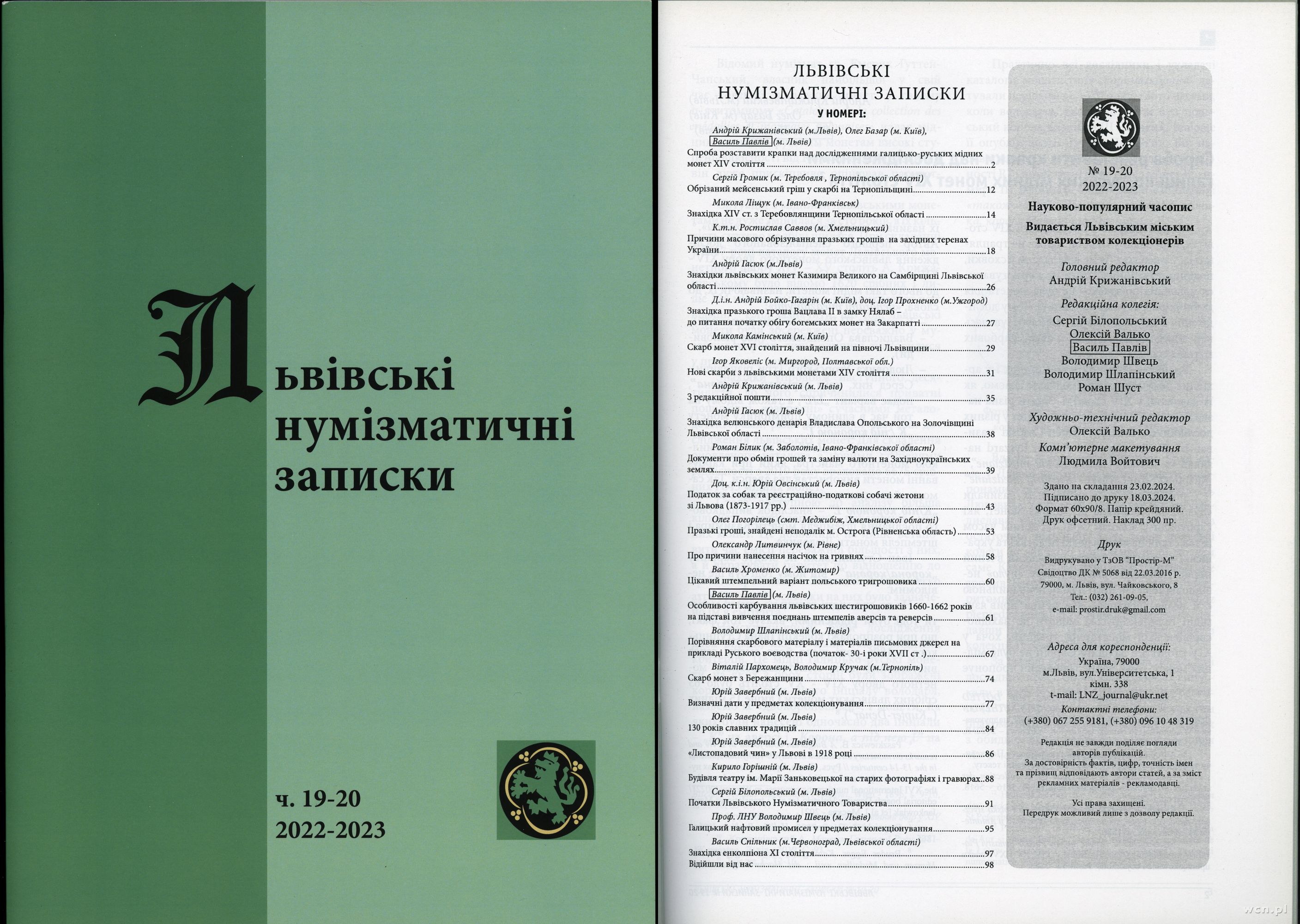 czasopisma, Львiвськi нумiзматичнi записки (Lwowskie Zapiski Numizmatyczne), nr 19–20/..