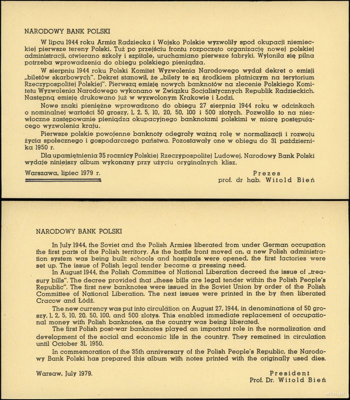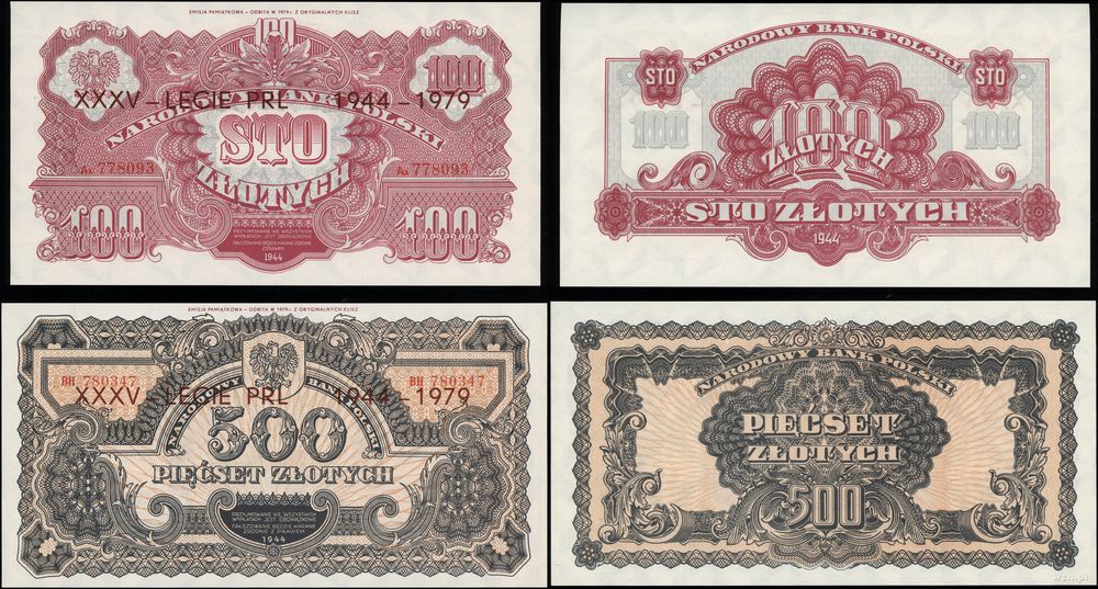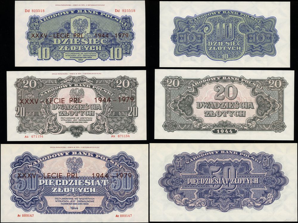 | Opis: | Polska - Polska Rzeczpospolita Ludowa (1952–1989), komplet banknotów emisji pamiątkowej 1979, w skład zestawu wchodzą: 50 groszy, 1, 2, 5, 10, 20, 50, 100 i 500 złotych 1944, wszystkie z nadrukiem: EMISJA PAMIĄTKOWA - ODBITA W 1979 r Z ORYGINALNYCH KLISZ. Przez środek w poziomie nadruk XXXV - LECIE PRL 1944-1979 |
