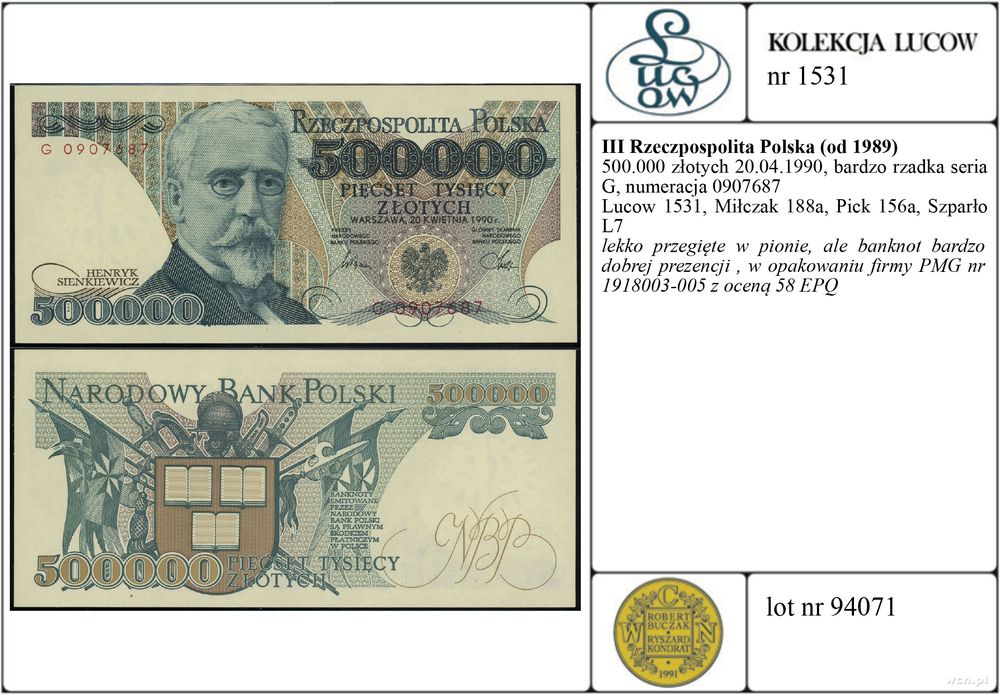 | Opis: | Polska - III Rzeczpospolita Polska (od 1989), 500.000 złotych, 20.04.1990, bardzo rzadka seria G, numeracja 0907687 |