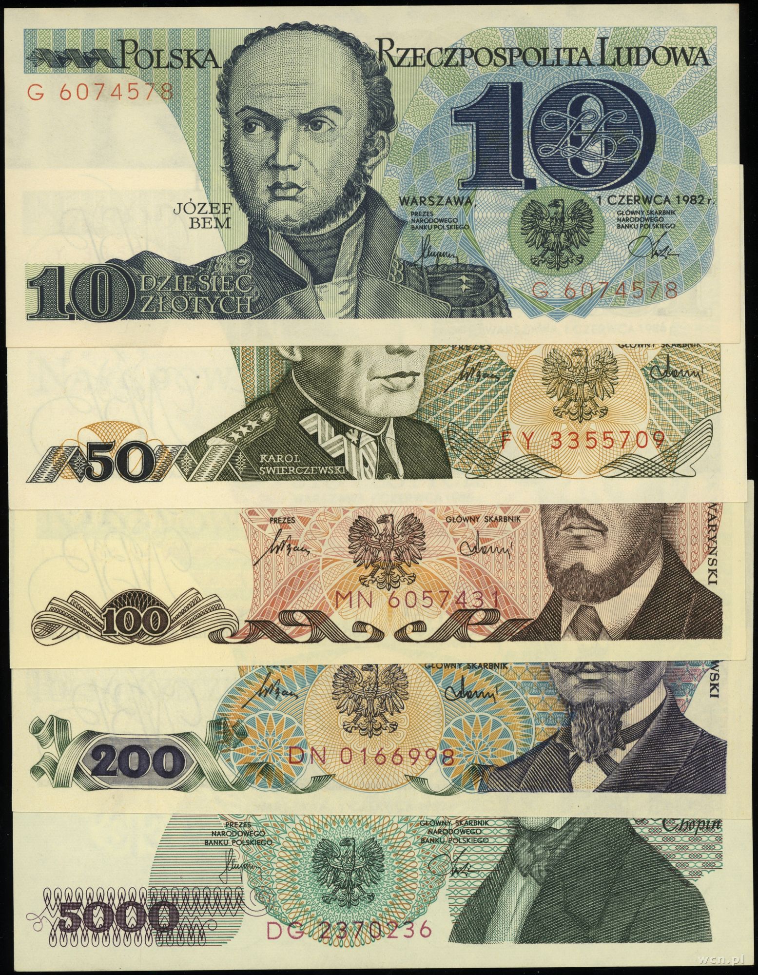 Polska, zestaw 5 banknotów, 1982–1986