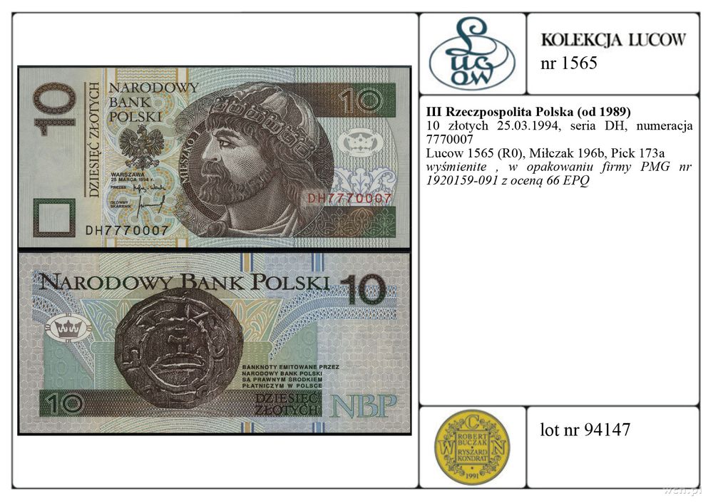 | Opis: | Polska - III Rzeczpospolita Polska (od 1989), 10 złotych, 25.03.1994, seria DH, numeracja 7770007 |