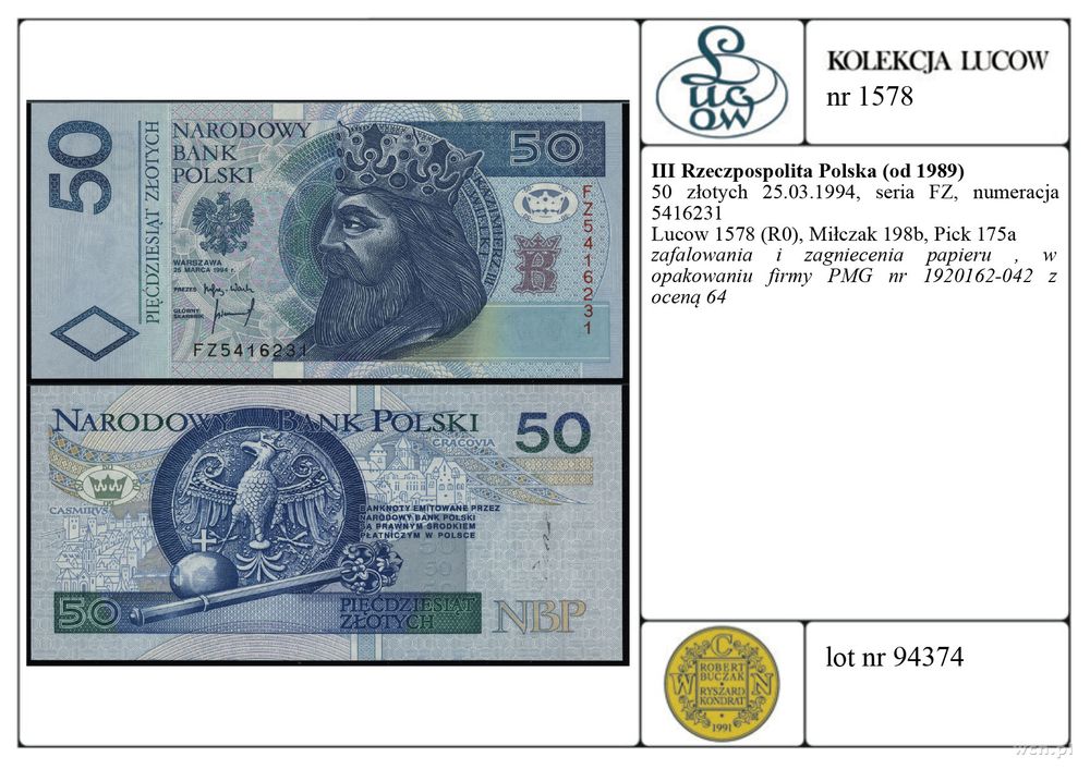 | Opis: | Polska - III Rzeczpospolita Polska (od 1989), 50 złotych, 25.03.1994, seria FZ, numeracja 5416231 |