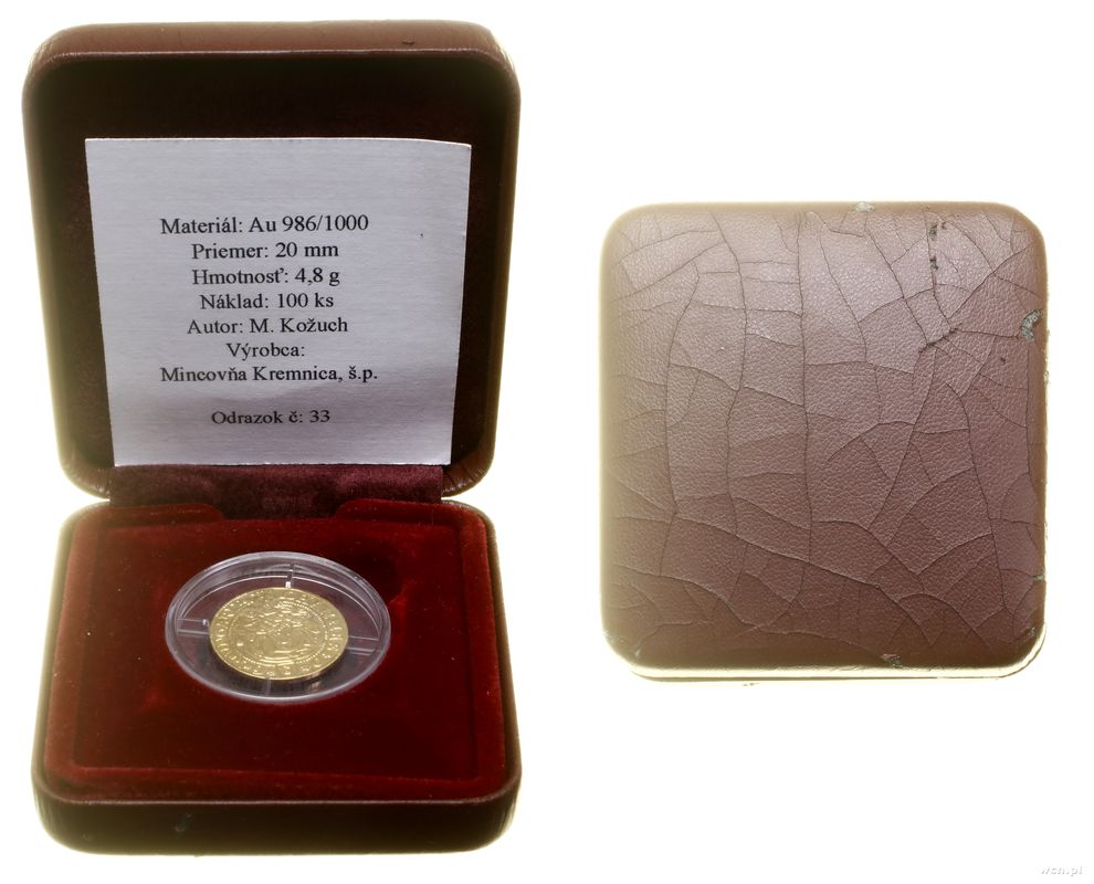 | Dodatkowe informacje: | złoto próby 986, 19.8 mm, 4.56 g, lekko przetarty, moneta w plastikowym kapslu i oryginalnym pudełku z certyfikatem, nakład 100 sztuk |