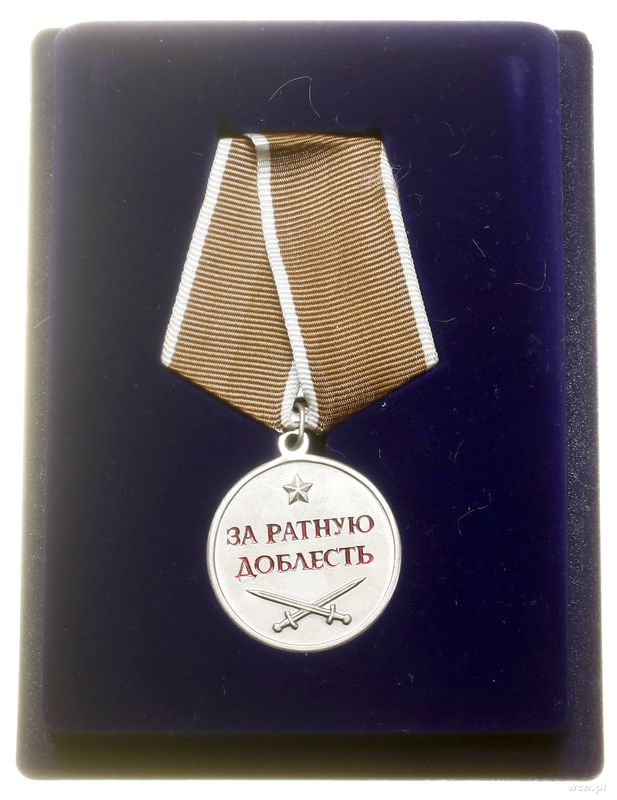 | Opis: | Rosja - Federacja Rosyjska (od 1991), Medal „Za waleczność” (Медаль «За ратную доблесть»), 2004, Pięciopromienna gwiazda, niżej ЗА РАТУЮ / ДОБЛЕСТЬ, niżej dwa skrzyżowane miecze, na stronie odwrotnej karabin maszynowy w wieńcu, РОДИНЕ - ЧЕСТЬ И ОТВАГА, odznaka jednoczęściowa, mocowana na wstążkę |