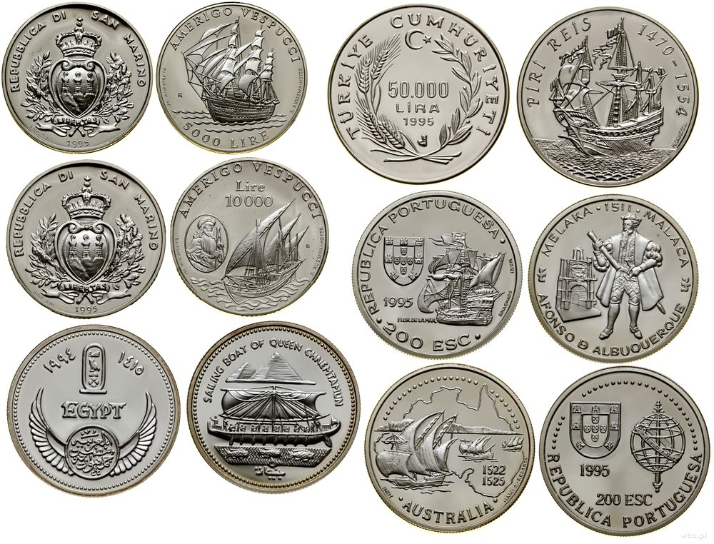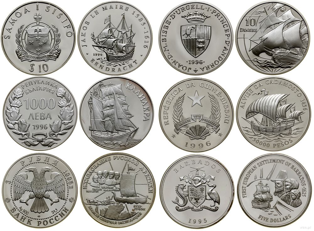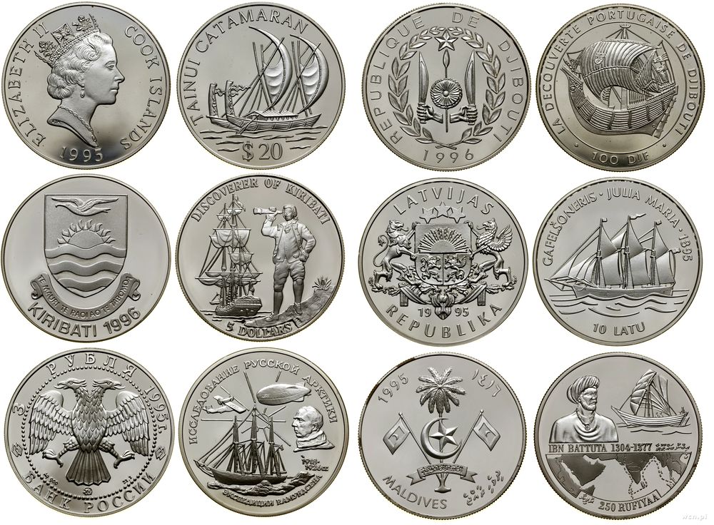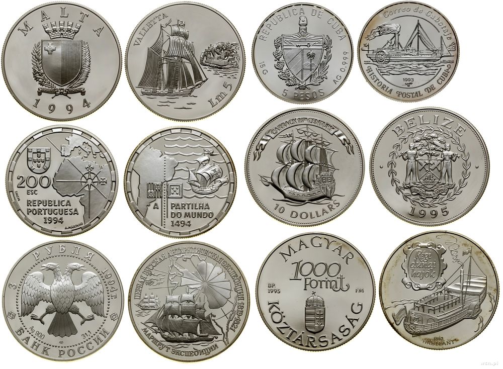 | Opis: | różne, zestaw 36 monet z serii "Historia podróży morskich", w zestawie: 10 pesos 1996 (Kuba), 3 ruble 1996 (Rosja), 5 dolarów 1996 (Nowa Zelandia), 1 rial 1996 (Oman), 50 kip 1988 (Laos), 10 pesos 1997 (Kuba), 10.000 lirów 1997 (San Marino), 200 eskudo 1996 (Portugalia), 3 rubli 1996 (Rosja), 1 dolar 1992 (Wyspy Cook'a), 5.000 lirów 1997 (San Marino), 2.000 forintów 1997 (Węgry), 10 dolarów 1996 (Samoa i Sisifo), 1.000 lew 1996 (Bułgaria), 3 ruble 1995 (Rosja), 10 dinarów 1996 (Andora), 50.000 pesos 1996 (Gwinea Bissau), 5 dolarów 1995 (Barbados), 20 dolarów 1995 (Wyspy Cook'a), 5 dolarów 1996 (Kiribati), 3 ruble 1995 (Rosja), 100 franków 1996 (Dżibuti), 10 łatów 1995 (Łotwa), 250 rupii 1995 (Malediwy), 5 lirów 1994 (Malta), 200 eskudo 1994 (Portugalia), 3 ruble 1994 (Rosja), 5 pesos 1993 (Kuba), 10 dolarów 1995 (Belize), 1.000 forintów 1995 (Węgry), 5.000 lirów 1995 (San Marino), 10.000 lirów 1995 (San Marino), 5 funtów 1994 (Egipt), 50.000 lirów 1995 (Turcja), 200 eskudo 1995 (Portugalia), 200 eskudo 1995 (Portugalia) |