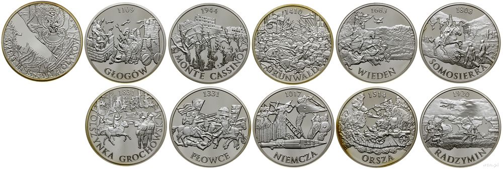 | Opis: | Polska - III Rzeczpospolita Polska (od 1989) - Mennica Warszawska, zestaw medali z serii Wielkie Bitwy Polaków, w zestawie: Niemcza 1017, Głogów 1109, Płowce 1331, Grunwald 1410, Orsza 1514, Wiedeń 1683, Somosierra 1808, Olszynka Grochowska 1831, Radzymin 1920 i Monte Cassino 1944 |