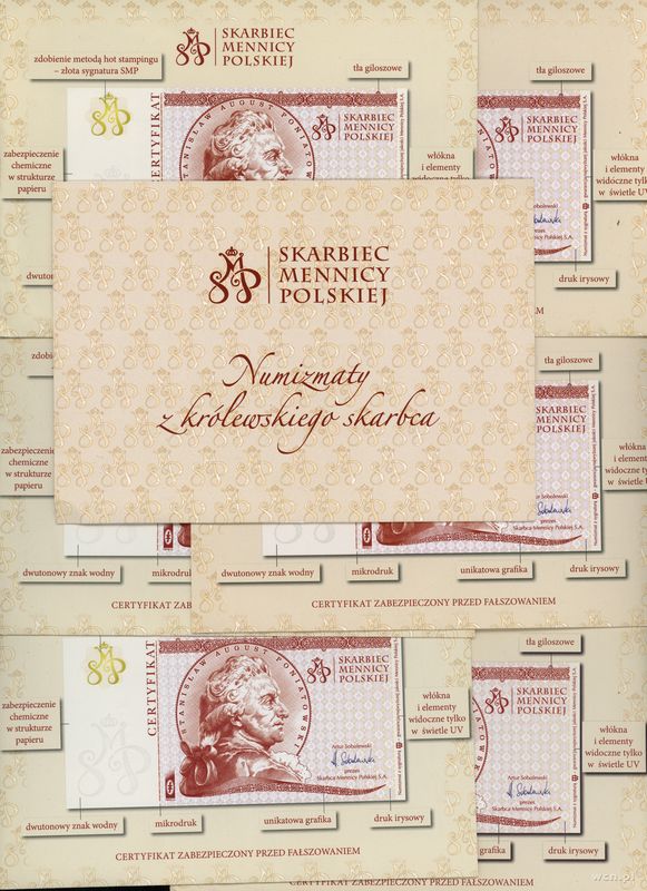 | Dodatkowe informacje: | srebro próby 925, 10 x ok. 14 g, całość w pudełku Skarbca Mennicy Polskiej w formie kontura państwa Polskiego, dołączone certyfikaty, całość w oryginalnym pudełku |