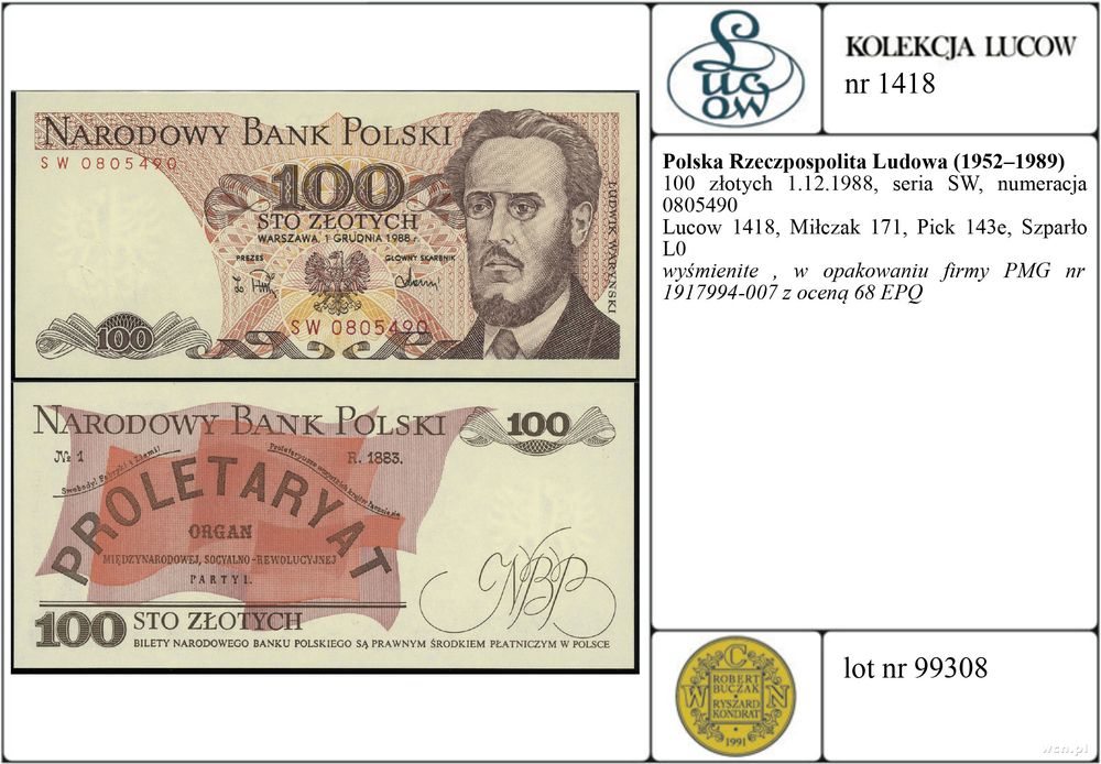 | Opis: | Polska - Polska Rzeczpospolita Ludowa (1952–1989), 100 złotych, 1.12.1988, seria SW, numeracja 0805490 |