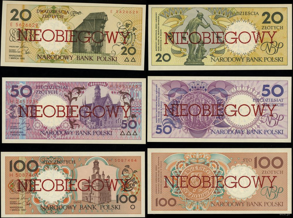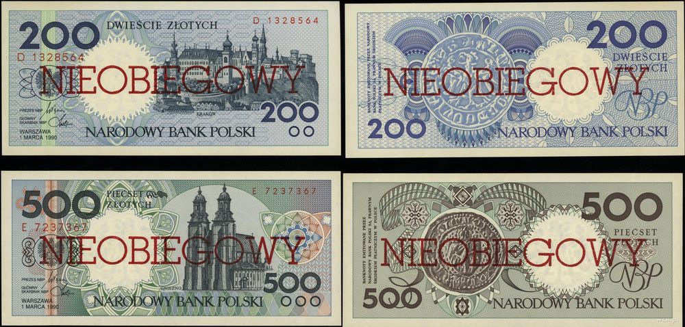 | Opis: | Polska - III Rzeczpospolita Polska (od 1989), komplet banknotów serii miasta polskie, 1.03.1990, nominały: 1, 2, 5, 10, 20, 50, 100, 200 i 500 złotych z nadrukami NIEOBIEGOWY po obu stronach |