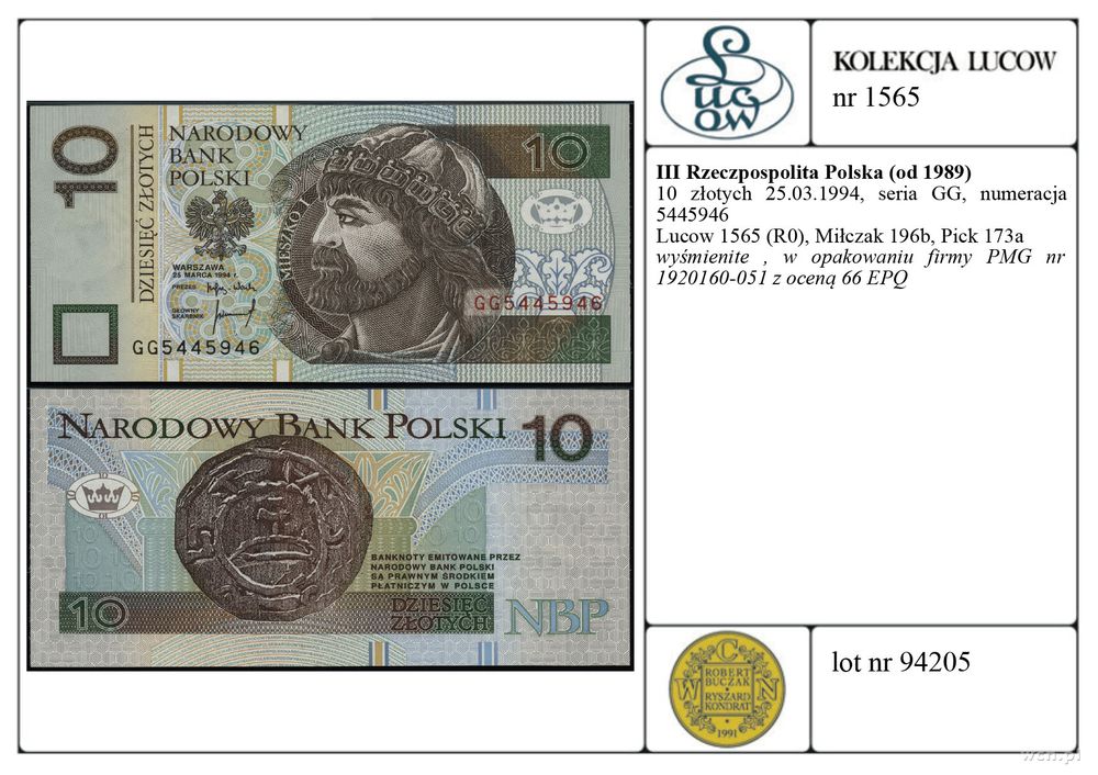 | Opis: | Polska - III Rzeczpospolita Polska (od 1989), 10 złotych, 25.03.1994, seria GG, numeracja 5445946 |